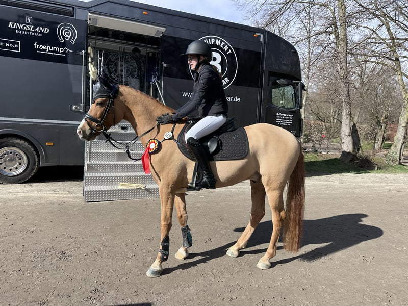 Sainte's Delapan is een 10-jarige ruin, een getalenteerde Duitse rijpony met een goede basisopleiding en een veelzijdig inzetbaar profiel. Hij is gefokt voor dressuur en springen en kan in beide disciplines worden ingezet. Hij kwam op vijfjarige leeftijd bij ons en is sindsdien gegroeid met onze toen 12-jarige dochter. In het springen heeft hij A*-plaatsingen en is voorgesteld tot A**. In de dressuur is hij geplaatst tot klasse A en opgeleid tot klasse L. Zijn potentieel is nog lang niet uitgeput. In de veelzijdigheid heeft hij VE-plaatsingen en toont ook in deze discipline perspectief voor hogere klassen. Delapan brengt ons dagelijks aan het lachen met zijn manier van doen. Door zijn veelzijdige opleiding is hij natuurlijk geschikt voor ambitieuze kinderen. Hij kent de wedstrijden- en stalroutine, de Frankfurter Festhalle en is, bij voldoende vertrouwen, een betrouwbare partner. Hij gaat graag uit rijden, is bos- en verkeersveilig, laat zich zonder zadel en met halstertouw rijden en werkt gemotiveerd in de grondwerk. Hij leert graag kunstjes en nieuwe oefeningen. De verkoop gebeurt met pijn in ons hart, omdat onze dochter na haar eindexamen naar het buitenland vertrekt en wij geen passende ruiter meer voor hem hebben. Hij wordt uitsluitend in goede en stimulerende handen overgedragen, omdat hij verder opgeleid wil worden. Pan is smid- en transporteerproof en een schat in de omgang met kinderen. Wij wensen voor Pan dat hij op een plek komt waar hij geliefd wordt, dagelijks naar buiten kan en veel contact heeft met soortgenoten. Voor ons gaat daarom plaats boven prijs. Prijs en video's op aanvraag, graag via WhatsApp.