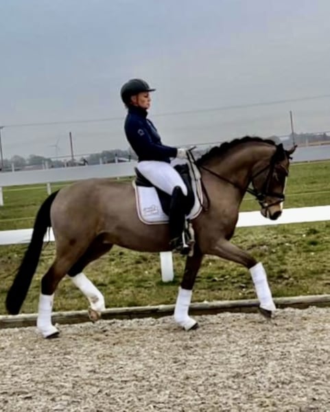 With the 6-year-old "Dance For Gold" we have a beautiful gelding in dream look to offer. In addition to its great presentation, it has three good basic gaits, as well as an absolutely great interior. In his dealings, he is super well-behaved and can not be disturbed by anything. Even small children can easily guide, clean and daddle it. "Danci" was carefully built up in the years before and was able to grow out in peace and enjoy his youth. Now he is physically grown and ready for new tasks. Due to its presentation and its frame, it also easily covers adult riders. On the paternal side and also from the mother father, "Danci" combines the best performance lines and is therefore suitable for the upscale pony sport. His father "Dance For Me" was already able to win the Hamburg Pony Derby with his rider at the age of 6. His mother father "Danny Gold" can also boast many placements up to class L and his numerous descendants are just as successful in pony sports. With appropriate funding, a great sports pony matures here. As a 3-year-old there was a very good 20 pictures Tüv available. If you are seriously interested, you are welcome to 491707941333.