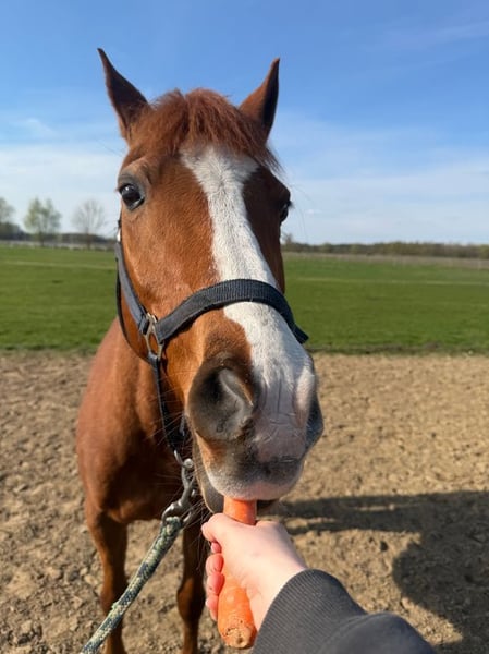 Charmanter braver Wallach Karlo wurde mit 5 Jahren (2018) von unserer Enkelin angeritten und ausgebildet. Er beherrscht alle 3 Grundgangarten. Alle Schutzimpfungen sowie Entwurmungen wurden regelmäßig durchgeführt. Durch Wachstum unserer Enkelin ist Karlo leider zu klein. Sie war gezwungen durch Ihre Körpergröße auf ein Großpferd umzusteigen. Dadurch diente unser Karlo die letzten 2 Jahre nur noch als Freizeitpferd.