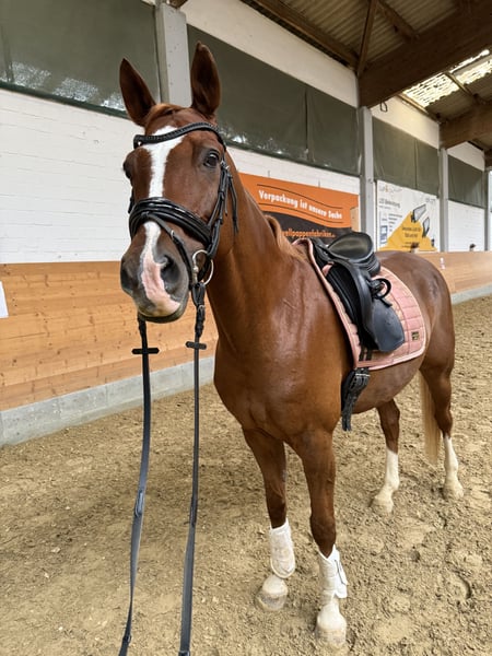 Verkaufe meinen 2013 geborenen wunderschönen XXL Fuchsponywallach. Stm. ca 154 DRP Top Christobell x Bavarottie Chicco steht aktuell in Boxenhaltung mit täglichem mehrstündigem Paddockgang, kennt aber auch Weide- und Gruppenhaltung im Sommer. Er ist sehr sozial und liebt es mit anderen Pferden in Gesellschaft zu stehen. Auch Stuten und Fohlen sind kein Problem. 2019/2020 von der Vorbesitzerin in Dressur, Springen und Geländeprüfungen vorgestellt. Von mir nicht weiter gefördert. Ich bin Wiedereinsteigerin und habe in den letzten Jahren viel von Chicco gelernt. In Dressur und Springen läuft er sicher auf A Niveau. Benötigt allerdings einen schon erfahrenen Reiter der von oben auch mal Sicherheit geben kann. Traumhaft weiche Gangarten die super zu sitzen sind. Er liebt es zu springen. Kein Anfänger- oder Kinderpony! Chicco reagiert auf Heustaub und benötigt gewaschenes/ bedampftes Heu oder Heulage und steht auf Leinstroh/Späne. Er hat dadurch keine Einschränkungen. Chicco hat eine tolle Hufsubstanz und läuft Barhuf. Abzugeben aufgrund gesundheitlicher Probleme meinerseits.