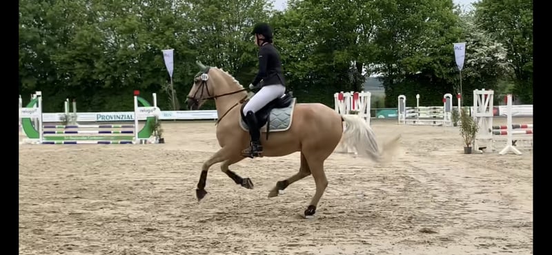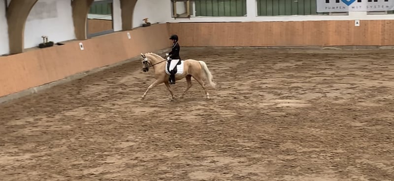 I am offering my 2010-born German Riding Pony gelding by Donnerwetter x Good Guffi for sale. He is a Palomino gelding standing just under 1.50 meters, which makes him well-suited for covering a variety of riders. He is actively competing in dressage at a solid L level, but also performs some elementary M-level movements and has jumped up to A** with me (a beginner). I had him on loan for a year and recently started reconditioning him alongside my training as an equine specialist with a focus on riding. His character is particularly remarkable. He is an absolute confidence-builder and was instrumental in introducing me to the sport years ago. I have also given beginner riders regular lessons on him, and he is exceptionally well-behaved both in handling and riding. He always wants to please and is motivated during work. Toffee stands correctly on his hooves and is farrier- and loading-friendly. A few years ago, he was diagnosed with loose-patella syndrome, which was treated once. The veterinarian confirmed that it causes no pain or impairment. It is only noticeable when he has little movement and spends a lot of time in the box. With normal training and regular turnout, it’s hardly detectable and has never caused any issues during the five years I’ve owned him. I see him as an excellent match for a mother-and-child combination, where he can serve as a teacher while still being worked correctly and healthily. Toffee is a little professor who teaches proper riding. He’s not a pony that just bucks around on top, but one that responds accurately to correct aids. His extremely calm nature combined with good basic gaits makes him the perfect instructor and sport partner. Feel free to contact me with any questions. :)