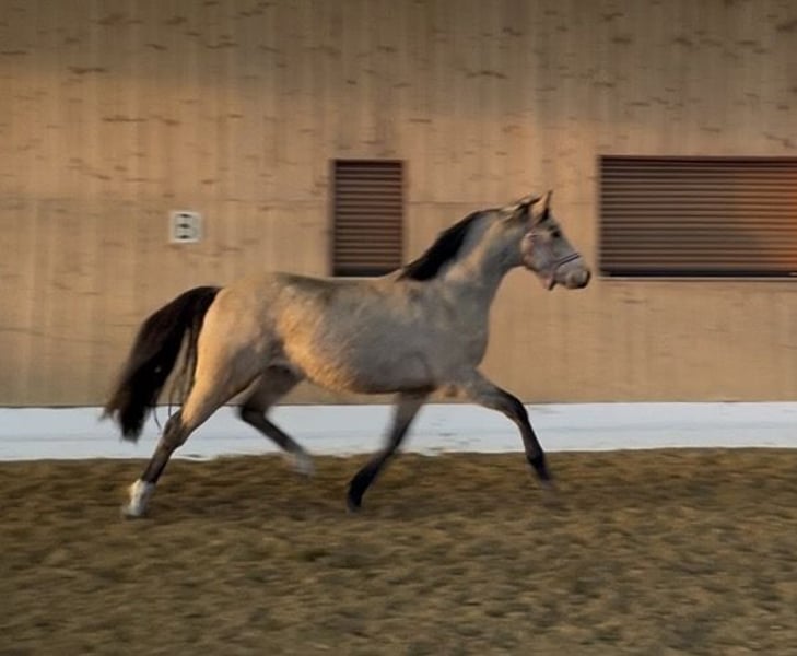 Poney gelding, 3 years old, with a dark mane, very good conformation.