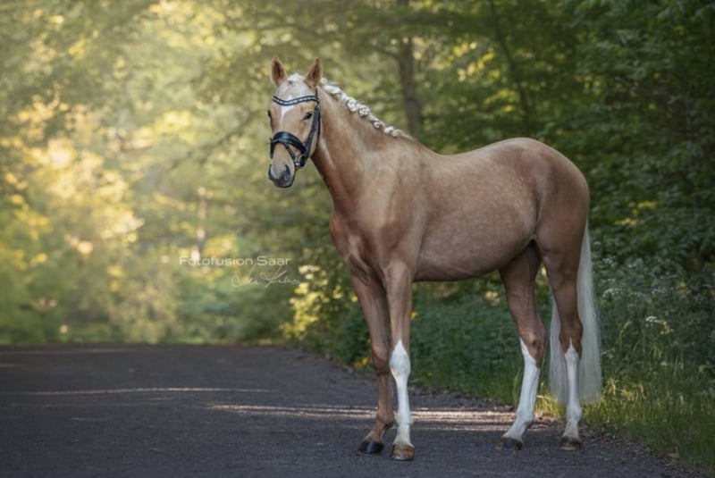 Zum Verkauf steht ein wunderschöner XXL Reitpony Wallach, geboren im Jahr 2022. Dieser charmante Palomino Wallach hat ein Stockmaß von 153 cm und eignet sich hervorragend für die Dressur. Unser Pony besticht durch sein freundliches Wesen und seine Lernbereitschaft. Er ist gut im Umgang und zeigt bereits vielversprechende Ansätze in der Dressurausbildung. Mit seinem eleganten Erscheinungsbild und seinem tollen Charakter ist er der ideale Partner für Kinder oder auch für den Erwachsenen. Er ist sowohl im Umgang als auch unter dem Sattel brav. Das Pony ist gesund, geimpft und entwurmt. Er besitzt einen TÜV ohne Befund.
