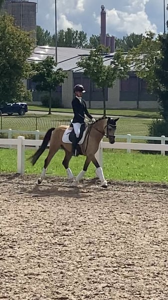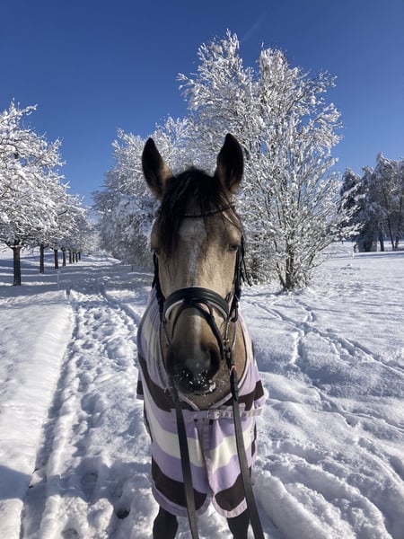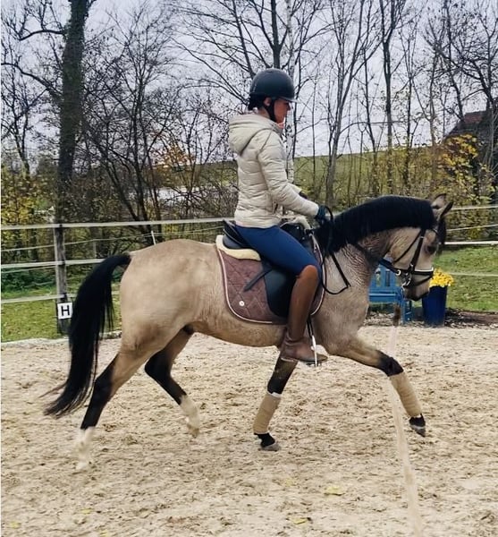 Sometimes circumstances change, and one has to make decisions that are not easy. Due to a developing summer eczema since we live directly by the stream, as well as my daughter's "outgrowing" (age & size), we are reluctantly selling a stylish but sensitive pony gelding. "Frodo" impresses with his great presence, lively movements, and high sensitivity. Under saddle, he is definitely not a horse for beginners and occasionally shows some spookiness; he needs a rider who can provide him with confidence. In daily handling, he is friendly, curious, and very people-oriented. Under saddle, as mentioned, he requires a calm, consistent rider. Farrier, veterinarian, and trailer loading are absolutely problem-free. Not suitable for beginners - ideal for ambitious riders who enjoy sensitive horses and are looking for a partner for dressage work. He has already achieved victories and placements in dressage competitions. He will not be made available for lease or given away for feed. However, we are letting him go for far below his value due to the aforementioned points!