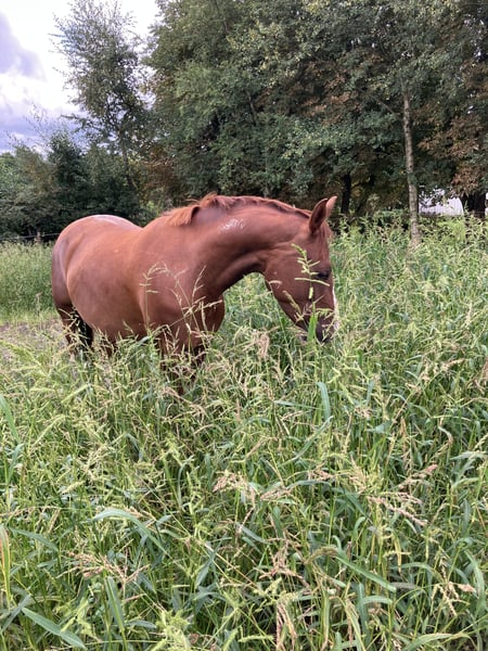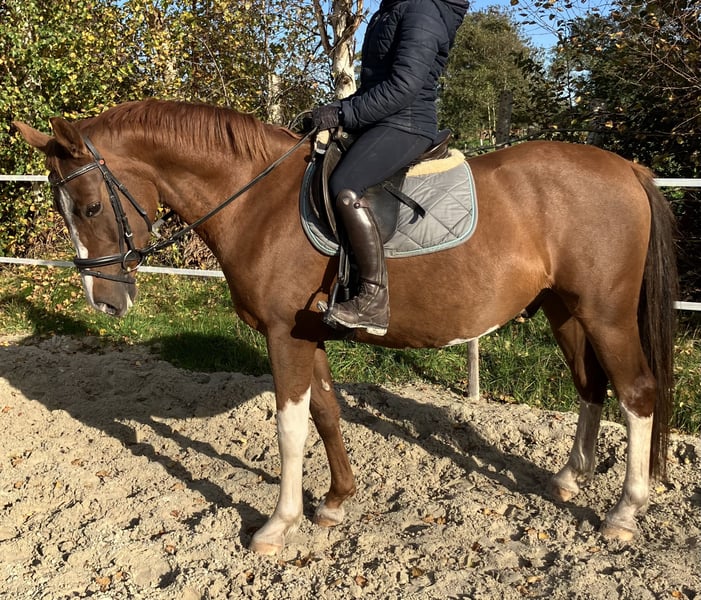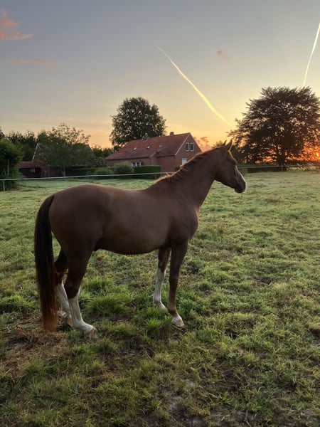 Zum Verkauf steht ein sehr lieber und motivierter 4-jähriger Wallach (ca. 1,51 m) von Cosmo Royale aus einer Black-Delight-Mutter. Er besticht durch seine außergewöhnlich auffällige Zeichnung: Fuchs mit breiter Blesse, vier weißen Beinen und einem großen weißen Fleck unterm Bauch – ein echter Hingucker. Seit August ist er schonend angeritten und wird zwei- bis dreimal pro Woche gearbeitet. Unter dem Sattel zeigt er sich super brav, ruhig und unkompliziert, lässt sich in allen drei Grundgangarten angenehm reiten und möchte seinem Reiter immer gefallen. Vom Typ her ist er ausgeglichen und sehr verschmust, macht im täglichen Umgang alles brav mit und zeigt sich auch beim Verladen sowie im Anhänger völlig problemlos. Durch seine Größe eignet er sich besonders gut für größere Jugendliche oder kleinere Erwachsene, die einen sicheren, freundlichen und gut auszubildenden Partner suchen. Ein absolut sympathischer junger Wallach, der durch sein tolles Wesen und seine besondere Optik täglich Freude bereitet und mit weiterer Förderung ein wunderbarer Begleiter für Freizeit, Ausbildung oder später auch den Sport werden kann.