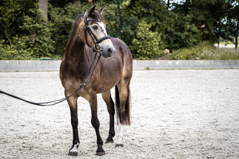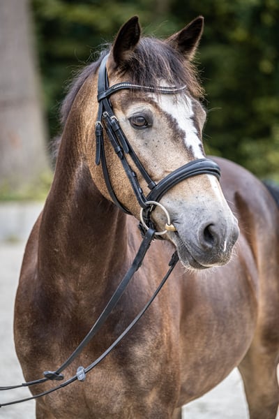 We are selling our six-year-old German Riding Pony, 'Hesselteichs Donnerblitz,' sired by Hesselteichs Don't Forget Me × Lucky Lao I. He is confident and eager to learn, and has been ridden in all three gaits. He has already completed some small jumps under saddle. He is capable of lateral movements from the ground and can be parked at the mounting block. Additionally, he enjoys pole work and calmness training. He is very social and gets along well with other horses. Currently, he is turned out with another gelding, but he has also shared pastures or paddocks with mares. He is familiar with dogs, cats, cows, and tractors, and remains very relaxed around them. X-ray images from 2023 are available and can be viewed upon request. If interested, we look forward to arranging a viewing appointment.