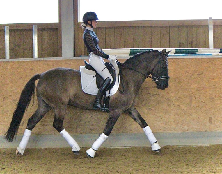 Im Auftrag liebevolles XXL Pony für die ganze Familie. 6 Jährig, 154 cm groß und ein absoluter Kumpeltyp. Ein Pony mit 3 sehr guten Grundgangarten, wobei besonders der Schritt hervorzuheben ist. Dressurmäßig auf A/L Niveau geritten und springt auch einen E-Parcour (Springen wenig gefördert). Ging erfolgreich Reitabzeichenprüfung in Dressur und Springen. Absolut brav und verlässlich. Sowohl im Umgang, beim Hufschmied, beim Tierarzt, Hängerfahren, Reiten in der Halle oder auf dem Platz.