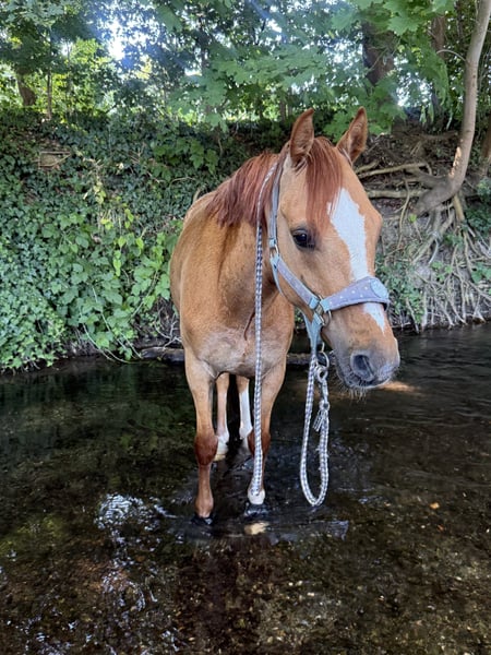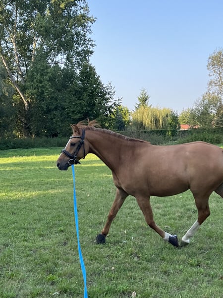 If everything fits, I would consider parting with my beloved Welsh Pony gelding due to time constraints. He was foaled in 2019 and has an approximate height of 14 hands. I purchased him as a three-year-old stallion from a breeder, had him gelded, and personally backed and trained him. He is well-behaved in handling, rides confidently alone and in groups in the terrain, and shows dressage ambitions on the arena, which I haven't been able to further develop due to lack of time. Children can easily lead, groom, and pamper him; he is also well-behaved with the farrier and veterinarian. Currently, he wears front shoes, but this is not a necessity. He is regularly dewormed, and his teeth are checked routinely. He has shown no bad habits so far, but he requires experienced handling as he needs reassurance. During the summer, he is on pasture, and in winter, he stays in a stable with daily turnout, which I would like to continue for him. No injuries or health issues are known. He is compatible within the herd but tends to jump on mares.