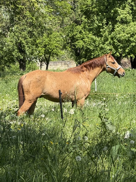 Si tout va bien, je serais prêt à me séparer de mon cher poney de selle, pour des raisons de temps. Il est né en 2019 et mesure environ 1,40 m au garrot. Je l'ai acheté à l'âge de 3 ans en tant que hongre auprès d'un éleveur, l'ai débourré moi-même et l'ai formé. Il est gentil en main, monte en toute sécurité seul ou en groupe en extérieur, et montre des ambitions en dressage sur le manège, que je n'ai pas pu développer davantage par manque de temps. Les enfants peuvent le mener, le brosser et le câliner sans problème, et il se montre calme chez le maréchal-ferrant et le vétérinaire. Actuellement, il porte des fers à l'avant, mais ce n'est pas une nécessité. Il est régulièrement vermifugé et ses dents sont contrôlées périodiquement. Jusqu’à présent, il n’a montré aucune mauvaise habitude, mais il a besoin de mains expérimentées pour assurer sa sécurité. En été, il pâture sur la pâture, et en hiver, il est au box avec une sortie quotidienne au pré, ce que je souhaite également pour lui à l'avenir. Aucune blessure ou problème de santé n’est connu à ce jour. Il est compatible avec le troupeau, mais a tendance à sauter sur les juments.