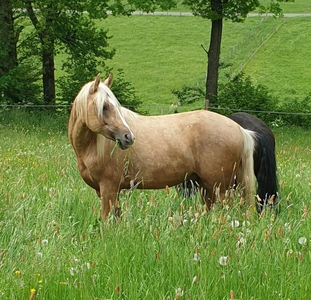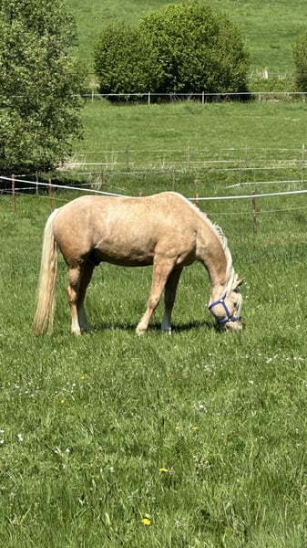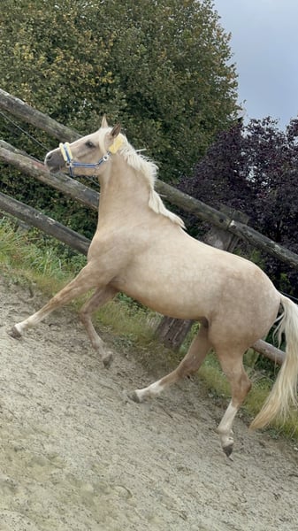 Schweren Herzens suche ich für meinen sensiblen, traumhaften Palominowallach ein neues, liebevolles Zuhause. ✨ Er ist einfach ein Herzenspferd – bildschön, fein im Charakter, verschmust und immer bemüht, seinem Menschen zu gefallen. • Deutsches Reitpony XL, Wallach, geb. 2019 • ca. 152 cm, Palomino, volles Papier • Barhuf, gesund, Zähne gemacht, regelmäßig geimpft (Tetanus, Influenza, Herpes), Physio & Osteo • Aufgewachsen in artgerechter Jungpferdeherde, kennt Offenstall, 24/7 Weide und Paddockbox mit Weidegang • Brav im Umgang, sehr menschenbezogen und sozial verträglich Er wurde im Mai 2024 schonend angeritten, durfte den Sommer über noch einmal Pause machen und wird seit Oktober 2024 wieder regelmäßig drei Mal pro Woche geritten. Er zeigt sehr gute GGA, springt mit Freude und hat einfach unglaublich viel Qualität und Charme. Da er sensibel und noch in Ausbildung ist, wünsche ich mir für ihn einen erfahrenen, geduldigen Menschen, der ihn weiter fördert und ihm Zeit zur Entwicklung gibt. noch Kein Anfänger- oder Kinderpferd. Eine Kombi aus erfahrener Mutter und gut reitendem Kind oder eine erfahrene Jugendliche mit entsprechendem reiterlichen Können könnte ich mir auch gut vorstellen. Verkauf nur an Privat in absolut gute, fördernde Hände mit artgerechter Haltung. Keine Videosammler – wer ernsthaft Interesse hat, darf ihn gerne kennenlernen. Probereiten nach Vereinbarung (30 €, werden beim Kauf verrechnet).