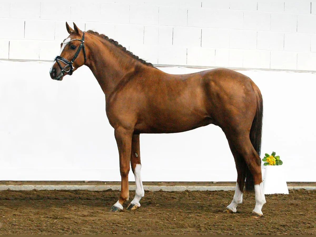 Father: Pinocchio S.W. Dam: v. Chantre B Beautiful chestnut stallion, not yet presented for licensing, very rideable, already presented in 2022 in jumping horses class A, with a lot of quality.
