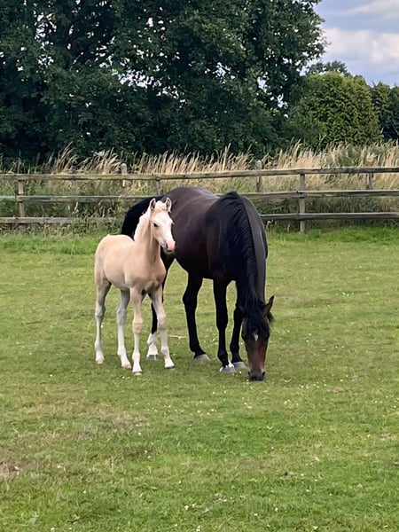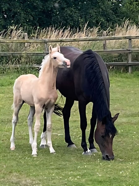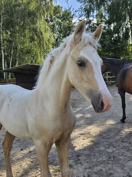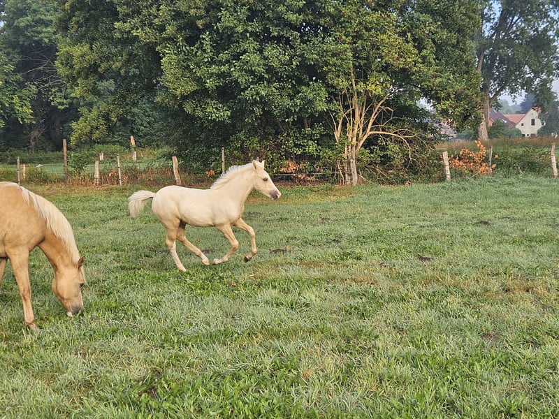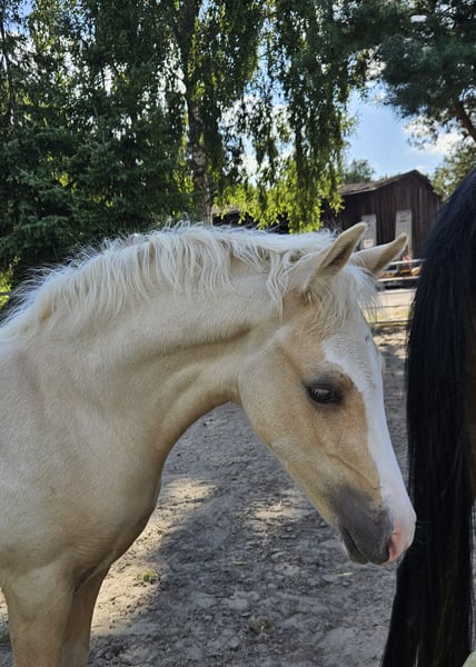 Our absolute buddy foal... this uniquely characterized gelding had to undergo surgery due to a scrotal hernia and was simultaneously castrated bilaterally without complications at the veterinary clinic. He is our sunshine, super sweet, lively, in a lovely whitish palomino color, long-legged with three correct gaits and a proper build. Due to his lineage, he is certainly versatile. He is familiar with trailer loading, the farrier, is halter-trained, and is pampered daily by the whole family. We love his balanced character. He lives full-time in a loose housing system with free access to pasture. Both father and mother are full-sized ponies. I am happy to answer any further questions by phone.