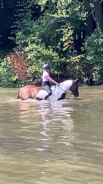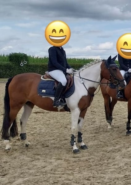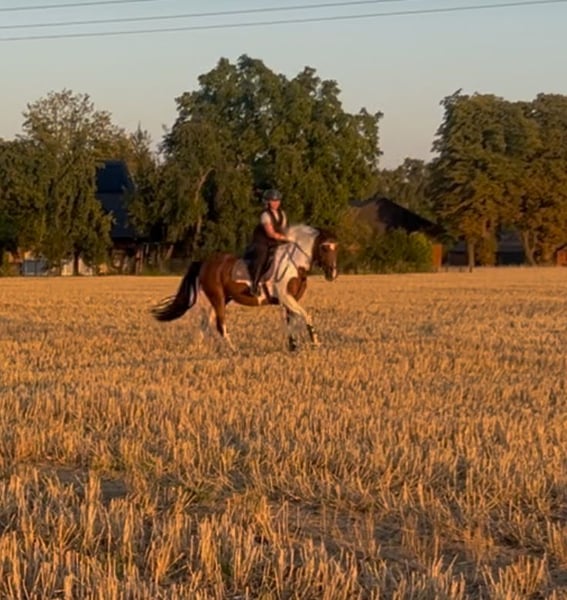 Zum Verkauf steht eine wunderschöne Scheckstute, mit einem freundlichen Wesen. Lotta ist eine ideale Begleiterin für Reiter aller Erfahrungsstufen. Sie hat ein robustes Fundament und kann daher auch gut von einem Erwachsenen geritten werden. Aber auch die kleinsten trägt sie brav von der Longe, durch eine Führzügelklasse bis hin zu den ersten Springprüfungen. Grundsätzlich ist Lotta eher der gemütliche Typ, der sich vor allem in der Dressurarbeit auf dem Platz ein wenig bitten lässt. Sie hat sehr bequeme Gänge, die gut zu sitzen sind aber demnach wenig Schwung mitbringen. Dennoch ist sie bereits in Dressurreiterprüfungen der Klasse A platziert. In Springprüfungen bis 80 cm ist sie eine zuverlässige Begleitung und ins Gelände geht sie sowohl alleine als auch in der Gruppe. Wir selbst haben Lotta für unsere 8 jährige Tochter gekauft, die aber leider kein Interesse am Reitsport hat. Unsere 11 jährige Tochter ist neben der Schule mit ihrem eigenen Pony ausreichend beschäftigt, so dass wir uns für einen Verkauf von Lotta entschieden haben. Bei Interesse oder weiteren Fragen stehe ich gerne zur Verfügung. Kontaktieren Sie mich dafür gerne unter 0163 55 99 724!