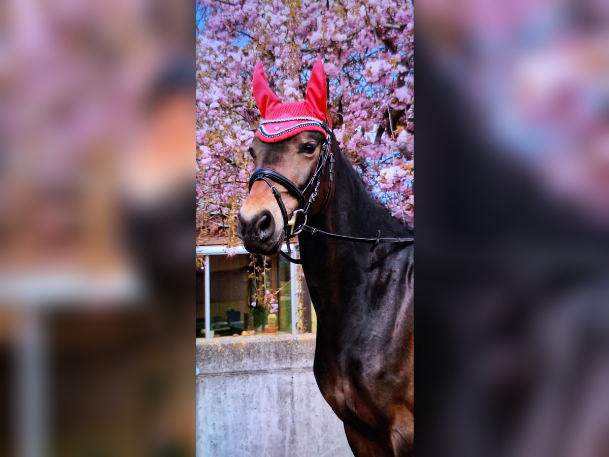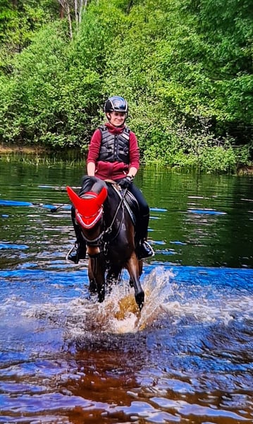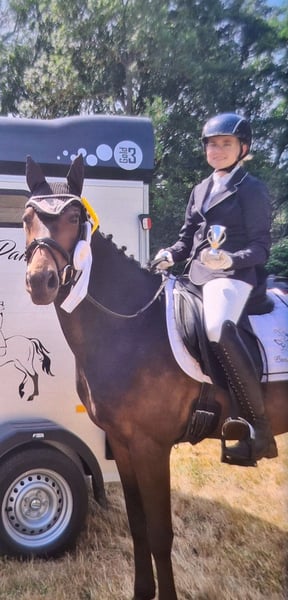 Panamera is a 13-year-old mare by Strahlemann out of Galileo/ Constantin, with a height of 154 cm (measured as an end-size pony at 148 cm). We have owned her since February 2019, having purchased her directly from the breeder. The pony has no vices whatsoever. She possesses above-average movement and an impressive presence with plenty of expression. She is the perfect partner for advanced dressage, eventing, or show jumping. Due to her size, she is ideally suited for both young, emerging riders and more experienced equestrians. Panamera has been regularly presented at riding days and competitions, achieving multiple wins in dressage up to A* level and placements in A** classes. During winter training, she has been prepared with dressage exercises at L-level and is fully ready for the upcoming competition season. In jumping, she has been competed at E-level with successful placements. In training, she has jumped up to A-level but could benefit from further development in this discipline. She clearly enjoys jumping, which makes a sport career in show jumping or eventing very feasible. The pony has already participated in cross-country training sessions with her rider, which she thoroughly enjoys. In handling, Panamera is well-mannered, friendly, and very affectionate due to her people-oriented nature. In the herd and stable, she is approachable and curious towards other horses and humans. She is the dominant mare in her herd. Currently, Panamera spends her days on pasture in a mixed herd and stays in her box at night. She is shod, load-trained, and very well-behaved during veterinary visits (vaccinations and teeth checks). She is four-hoofed and has been regularly vaccinated and dewormed. Her teeth are checked as needed (at most every two years). She has always been in excellent health with no prior illnesses. Panamera has previously foaled a foal, which she delivered and cared for without any issues. Panamera is a pony with a big heart. We are therefore seeking a new, 5-star home where she can ideally find her final place. The mare is not available as a school horse or to dealers. Price is secondary to finding the right home. This is not an emergency sale. If you are looking for a reliable and talented partner with whom to achieve shared success, please contact us to arrange a viewing and trial ride. A trial ride costs €35, which will be deducted from the purchase price. Please feel free to contact me for further information.