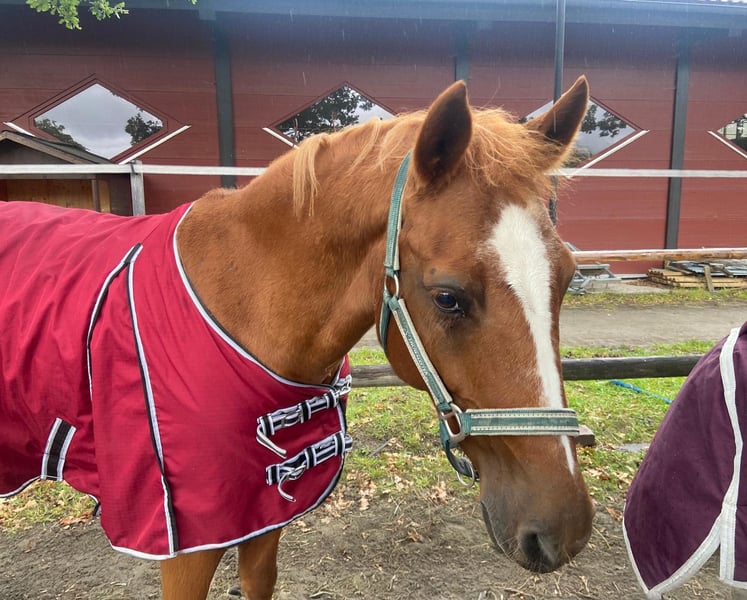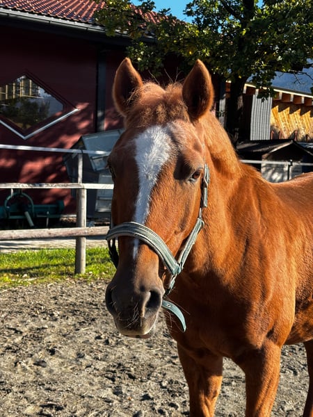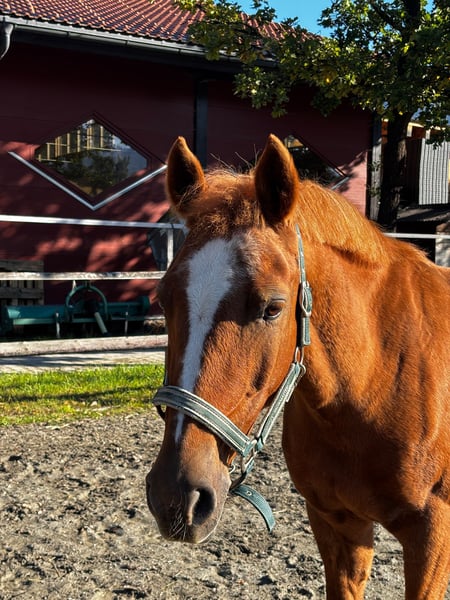 Since October, the lovely German Riding Pony mare Bella (15 years old, 14.6 hh) has been enriching our horse herd. This charming mare is now ready to pack her bags and, together with her special person, explore the world. Bella is a very sweet and gentle mare, whose friendly and delicate nature quickly wins hearts. At first, she may be a little shy and needs time to build trust. Once you have won her heart, she forms a deep, trusting friendship with her handler. Bella is truly an ideal pony! She is well-mannered, cooperative, and patient in her interactions. Whether on the ground or under saddle, Bella is always soft and well-behaved, eager to do her best. She is a very willing and sensitive ride, trained up to elementary dressage level with L/M-level lateral work. However, jumping is not her forte—it causes her stress and anxiety—so we are seeking a home without jumping ambitions. Instead, Bella has other great passions: she loves long walks in the woods, enjoys water, and has even been hand-swum. She also delights in varied trail rides, obstacle courses for agility and calmness, and fine work on the lead rein. Bella is a somewhat cautious pony, occasionally tending toward nervousness. She is afraid of hectic, restless, or overly excitable people. When tacking up, she needs calmness and a slow, step-by-step approach, with lots of praise. Bella is sensitive around her ears—she particularly dislikes being touched on the left ear. This sweet mare is looking for an experienced, sensitive, and loving person who can provide her with a calm environment where she can settle in and feel secure. Her owner should also value varied activities beyond riding to keep her engaged. Bella is in excellent health, fully vaccinated, dewormed, and chipped. She is very easygoing within the herd and gets along well with both mares and geldings. She tends to be middle-ranking and would thrive in a paddock with outdoor turnout, although a night box with daily turnout would also be possible.