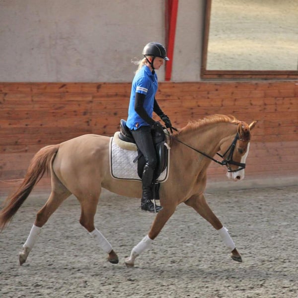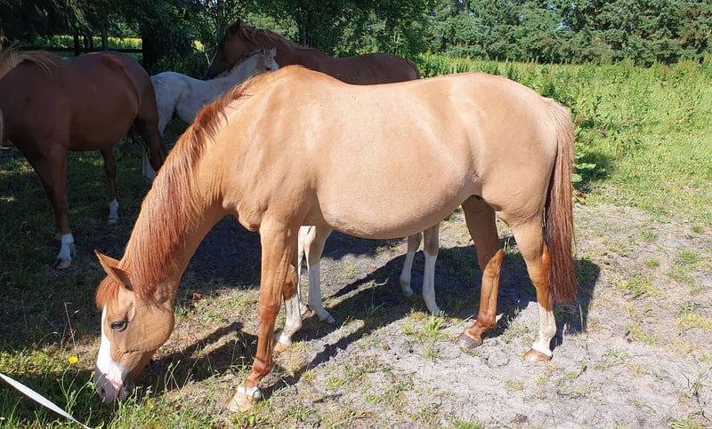 Wegen krankheitsbedingter Zuchtaufgabe - Zuchtstute - ganz besonderer Abstammung: 14-j Fuchsfalb-Stute, 147 cm. Springen L**-national zahlreiche Siege (Dänemark) – A-Dressur mehrmals platziert, aber interessehalber nicht weiter gefördert und jezt verletzungsbedingt jetzt (wirklich!) nicht mehr reitbar. Video aus 2021: https://youtu.be/5HHslqVWGMg?si=JUl-fKOeItg40qNi Vater: Elitehengst Heidberg‘s Nancho Nova, der, u.A., Vater des zweifachen Bundeschampions, Noir de Luxe, war. Weiter hinten dann die „Jahrhundert-Hengste“, Golden Dancer (MV) x Dornik B (UGV). Also eine ganz besondere Abstammung! Die Stute, Lady Nova, ist in Schleswig-Holstein (als Siegerstute) - mit guten Noten eingetragen und hatte 2024 ihr erstes Fohlen – ein ganz tolles Stütchen, dass beim Fohlenschau mit 9 für Typ und GGA und die Fohlenprämie bewertet wurde (für 5.5verk.). Video, Fohlen, 2024: https://youtu.be/YKgZP__vj1g Dieses Jahr hatte sie weiteres SF, 4/5 geb., v. westfälischen Reservesieger, 2008, HF Metropol (Sportname, FB Gangster). Das Fohlen wurde Sieger-SF und Reservesieger des Tages bei der Fohleneintragung (Noten: 9-7-8-8) ob wohl am Tag sehr "im Wachstum). Videos, Fohlen, 2025 hier: https://www.ridehesten.com/salgsheste/fredens-nadia-nadim/229516 Die Stute zieht Luft rein und ist (Cashlick-)genäht, aber hat beide Jahre problemlos aufgenommen (erstes Fohlen = erster Besamung, zweites Jahr beim zweiten Versuch, und das mit TG). Wegen Zuchtaufgabe ist sie dieses Jahr NICHT besamt. Sie kann gerne hier auf Koster des Käufers besamt werden. Standort Dänemark. Transport der Stute nach Deutschland gegen Dieselkosten möglich. Bitte nur ernstgemeinte Anfragen.