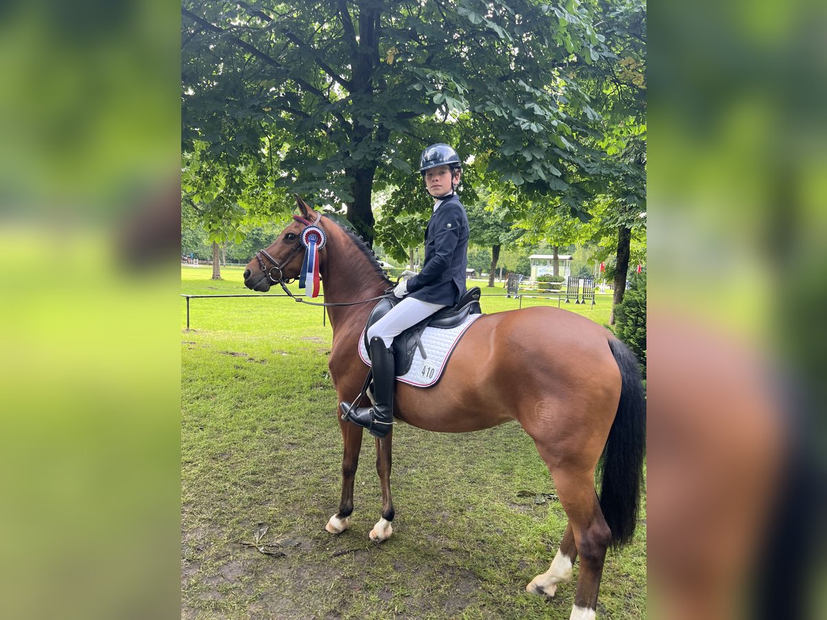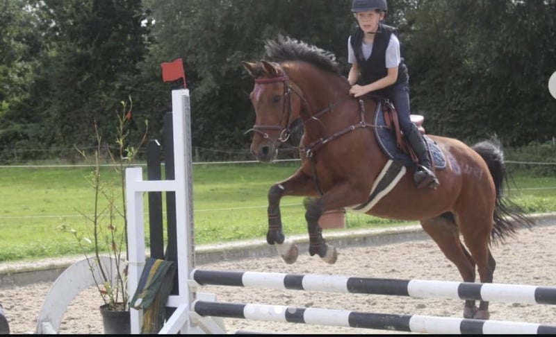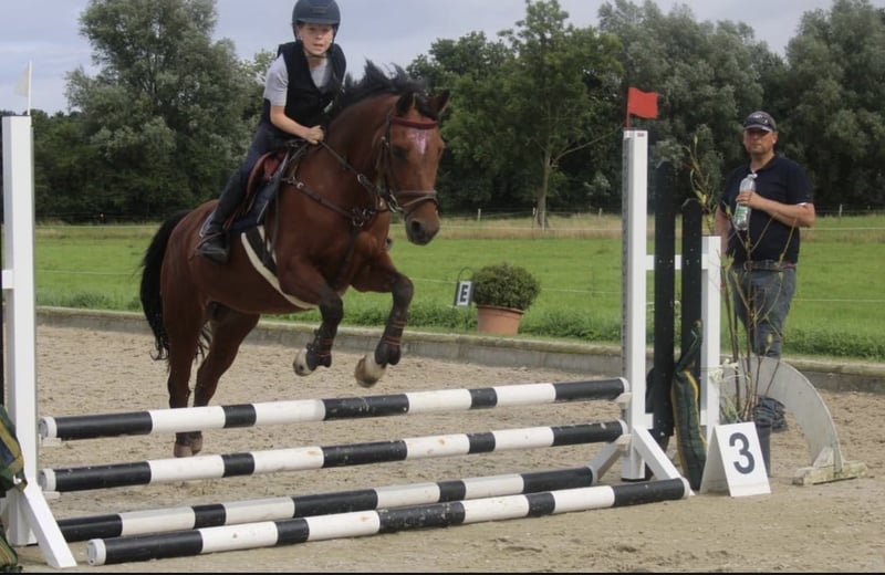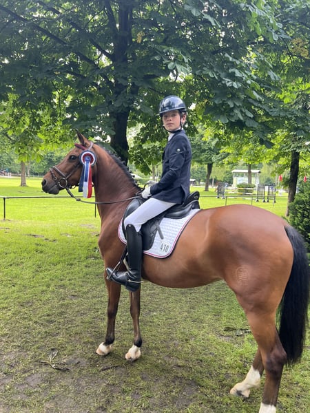 18 Jährige braune 1,42 cm hübsche, leicht rittige Ponystute. Schweren Herzens verkaufen wir Crestons Liberty oder auch liebevoll Katjes genannt wegen Umstieg auf Pferd. Sie ist sehr schön und leicht in der Hand, auf L Dressur Niveau ausgebildet und auch L platziert. Dressur A** gewonnen, diverse Platzierungen. Springen bis A ausgebildet, A ** gewonnen. Sie springt sehr gerne, braucht aber stets einen sicheren Reiter! Katjes springt gerne auch Geländehindernisse, mit den Vorbesitzern ist sie bis VA gelaufen. Kennt ohne Sattel reiten. Ist lieb auf Turnier, die letzten Jahre war sie in Reiterwettbewerben unterwegs. Die Stute wird nicht als reines Anfänger Pony verkauft! Da sie auch gerne flott unterwegs ist. In Kombination mit einem guten Reiter und viel Auslauf, kennt Offenstall wie auch Box, ist Katjes auch für schwächere Reiter reitbar. Kleine Erwachsene deckt sie gut ab. Sie läuft Barhuf und war bei uns nie krank. Kein Ekzem, keine Rehe. Kennt gemischte Herden. Lässt sich gut verladen, schmiedefromm, regelmäßig beim Zahnarzt, Herpes und Influenza geimpft. Katjes kann jederzeit gern Probe geritten werden.