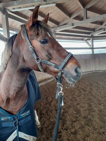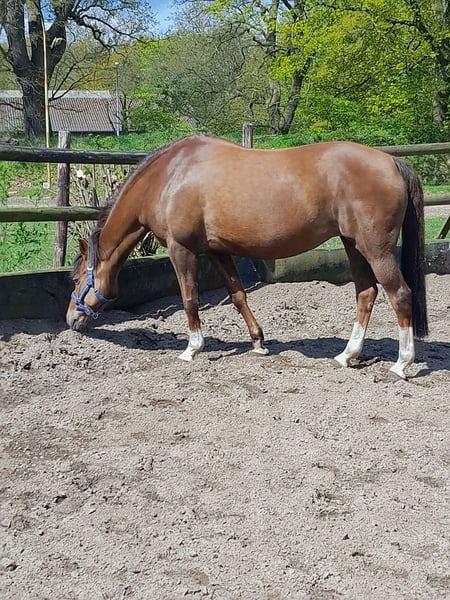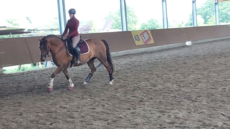 Fast 18 jährige dt. Reitponystute, Fuchs in schicker Optik aus persönlichen Gründen abzugeben. Bedingt Reitbar, tolles Bodenarbeitspony oder als Beistellpferd mit Ansprache. Volles Papier, Sie ca. 148cm STM. wurde von 12 und 16 jähriger regelmäßig geritten. Nahm am Unterricht und Dressurlehrgängen teil. (bis Ende 2024) Sie möchte gefallen umd möchte alles richtig machen. Sie hat gute Grundtempi und lässt sich gut arbeiten. Sie möchte beschäftigt werden und auch gefordert werden. Die Blau/Gelbe Welt der Dualaktivierung und Equikinetic ist ihr bereits bekannt. Lässt sich gut und einfach longieren, hört gut zu. Sie geht auch gern spazieren, kennt Kinder, Trecker, Autos, Hunde etc. Sie arbeitet gern und möchte alles richtig machen. Auch Doppellonge mit Lehrgang haben wir gemacht und bereiten ihr Spaß. Sie benötigt eine einfühlsame Hand und dennoch klare Ansagen. Am liebsten fragt sie nach „Kecksen“. So süß wie sie ist, muss man ihr auch ihre Grenzen aufzeigen. Sie geht mit vertrauten Personen auch alleine ins Gelände. Sie hat hinten rechts im Krongelenk Arthrose sowie eine Fehlstellung. Mit alubeschlag+Gummiplatte ist das zu korrigieren, sie nimmt es gut an. Sie darf belastet und geritten werden, wird jedoch nicht mehr 100% taktrein laufen und ggfls. kürzer treten. Zudem ist sie bei kalten Temperaturen steif und brauch ihre aufwärmphase. Sie arbeitet beim longieren und vom Boden gut mit. Das macht ihr Spaß. Sie möchte auch noch beschäftigt werden und nicht aufs Abstellgleis. Ihre arbeitsmoral ist tagesform abhängig. Darauf sollte man sich einstellen können und wollen! Probereiten nicht möglich da erst wieder am antrainieren! Tuniere definitiv nicht mehr möglich, was insgesamt geht, kann ich und auch kein anderer sagen und beurteilen. Mangels aktuellem Reiter wird Sie bei uns derzeit nur am Boden gearbeitet. Das Go zum starten ist vorhanden unter Berücksichtigung der aktuellen Tagesform. Stehen aktuell noch in der Klinik zur Reha (aquatrainer/bodenarbeit) und wechselt zu März in Pensionsstall. Gern an jemanden der nicht oder nur wenig reiten möchte und Gesellschaft / Bodenarbeitspartner sucht. Sie ist ein ein bis zwei Personen Pferd, benötigt in neuer Umgebung Zeit um sich einzugewöhnen und vertrauen zu fassen. Sie ist eine "typische Stute", manchmal zickig manchmal ganz lieb aber nie böse. Zur Haltung Nur in reine Stutenherden. Sie ist rangniedrig und muss in Ruhe fressen können. Nachts ist sie gern drin und für sich. Keine Abgabe in Offenstall! Optimal wäre paddockbox mit täglich freigang. Im Sommer keine 24/7 weide. Aufgrund der fehlstellung und Arthrose muss das Gewicht niedrig bleiben! Sie ist aktuell gegen Tetanus Influenza und Herpes geimpft Hinten alueisen+gummiplatte / vorne unbeschlagen Sie ist nur bedingt verladefromm, das müsste man wieder üben. Sie brauch Zeit und überredung. Lt. Vorbesitzerin ist Sie Heu/Strohstaub anfällig. Aktuell steht sie bei uns in einer Paddockbox auf Stroh mit Heu. Jeweils gute Qualität ohne Auffälligkeiten. Sie wird ohne Zubehör abgegeben! Preis bei entsprechendem Platz vor Preis