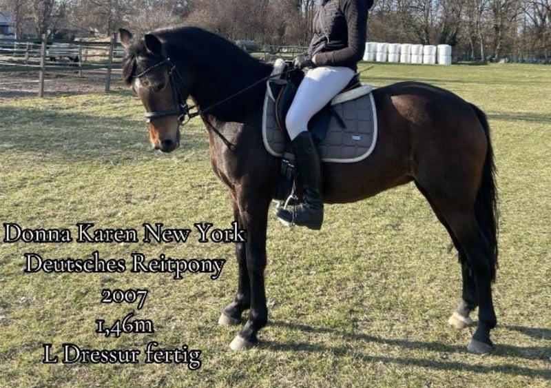 We unfortunately have to sell our Donna, as my daughter has outgrown her. Our German Riding Pony mare, born in 2007, is perfect for competing at the show level. She has plenty of go, making her easy to ride in the arena. The brown mare impresses with her reliable and attentive nature, as well as her solid training in dressage up to L level. With a height of 146 cm, she is ideal for ambitious young riders who value a well-trained and dependable horse. Donna has competed at the Landesmeisterschaften and has already produced two foals. She is well-trained in the dressage arena, demonstrating a pleasant basic quality, and is extremely kind both in handling and riding. The mare is healthy, regularly dewormed, and has a positive attitude. A versatile horse suitable for both dressage and leisure riding. We are only offering her into the best private hands—no dealers. Please feel free to contact me for more information or to arrange a viewing.