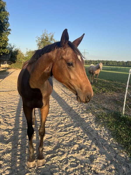 For sale only if the right match arises: soon to be a 2-year-old XXL riding pony mare. Her dam is an Oldenburg mare by Showstar, and her sire is a Reitpony stallion, Cox Nicholson. She is already 1.53 meters tall and I believe she will reach around 1.60 meters. She is kept in an open stable with a mixed herd, is familiar with basic foal handling, halter-trained, and behaves well with the farrier. She moves well. Please contact me preferably via WhatsApp, as I am not always available by phone: 017640503661.