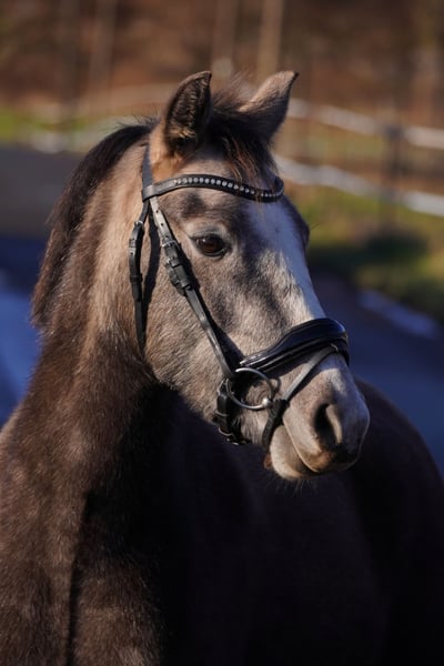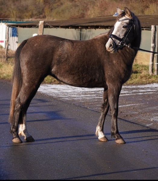 On behalf of a friend, a German Riding Pony mare born in 2023 is being offered. She is currently 135 cm tall and grey in color. This charming German Riding Pony mare was foaled in 2023 and impresses with her friendly nature and her lovely appearance. She is a daughter of the Welsh Pardbret mare Trinket, who is used as a children's and youth pony in leisure riding and also competes with her rider in WBO competitions. She can be seen in the last photos. She is paired with the well-built Riding Pony stallion Grand Coeur, who also impresses with his rideability and calm demeanor. She was raised in a small, mixed-age herd in private ownership with a family background. As a foal, she was awarded 24 points in her licensing. Her estimated final height is around 1.40 m. She has received regular vaccinations and deworming treatments. Total Gold has a pleasant temperament and is very well-behaved in handling. She has been lunged and tested in free jumping. She also proves to be very manageable in unfamiliar environments and loads easily by herself. Ideal for pony enthusiasts seeking a reliable and lovable leisure pony for self-education and training. For more information, questions, and videos, please feel free to contact me.