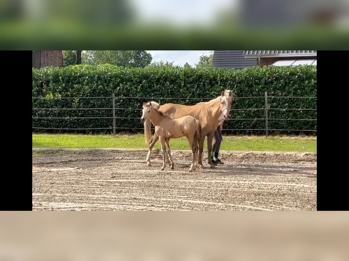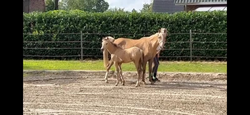 Future children's pony in special livery. This chic little pony lady is now allowed to move to a new home. She is intrepid and already knows the foal ABC. It will reach a final dimension of approx. 140 cm. The sire is Crown Dramatic and has the beautiful color Buttermilk Buckskin. A girl trqin with great GGA. Please contact us at 0151 44548149