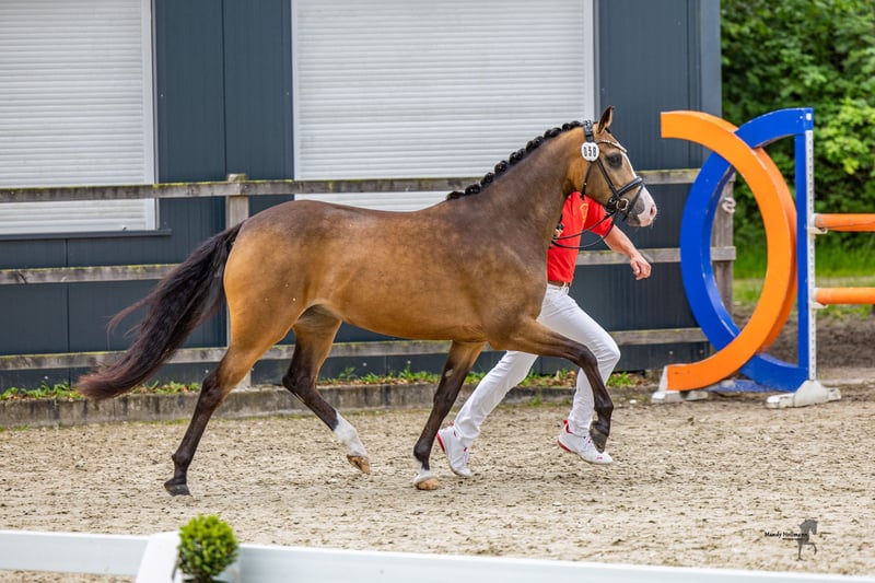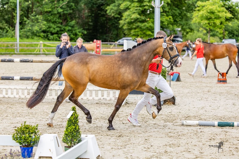 German Riding Pony mare, born in 2022, Buckskin, approximately 14.4 hh This stunning German Riding Pony mare impresses with her elegant appearance and gentle temperament. Born in 2022, she already shows great potential as a future dressage prospect. Not suitable for children! An absolute championship pony! The mare is well-started under saddle. Please feel free to contact me for further information or if you are interested. Viewings and test rides can be arranged by appointment.