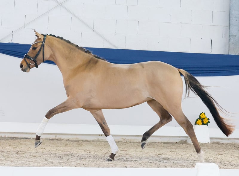 In unserer Kollektion stehen streng selektierte Youngster f�r alle Anspr�che: Ausbildungs-, Zucht- und Kinderponys Hier gelangen Sie zur Gesamtkollektion: https://ponyforum.auction Eine wunderschöne Ponyprinzessin steht mit der dreijährigen Braunfalbstute Dresscode Delia in unserer Kollektion. Sie ist ein äußerst typvolles und elegantes Pony, dabei passend im Endmaß stehend und top modelliert. Delia ist super aufmerksam in der Zusammenarbeit mit Menschen und ein absolutes Musterbeispiel eines jungen Ponys! Ihr Vater Diamantino Gold konnte sich bereits sechsjährig in Dressurpferdeprüfungen der Klasse L in die Erfolgslisten eintragen. Der Muttervater D-Power AT war Körungssieger in Westfalen und erfolgreich in DRE L. Aus dem Mutterstamm entspringen viele Dressurponys, die grade unter jungen Reitern erfolgreich im Sport unterwegs sind – so zb Nora Naseweis (DRE L), Dear Bönni (DRE L), Dear Danny (DRE M).