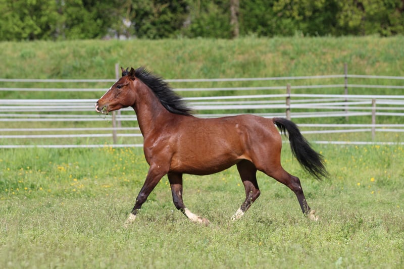 Jeune pouliche mare, de couleur brun foncé, avec un excellent mouvement