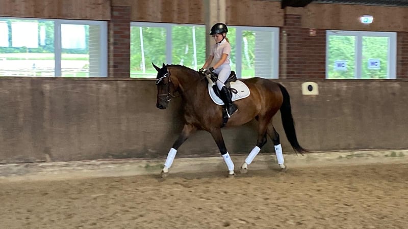 Directly from the breeder! This very elegant mare, in the ideal pony size, is ready for new challenges! Lady was raised with us and was lightly backed at the age of three. During the winter, she enjoyed a well-deserved break, as is customary here, before returning to work in May. She has three beautiful basic gaits and shows plenty of enthusiasm and engagement during her first small jumps under saddle. Her talent and excellent manners are already evident when free jumping. Lady is very easy to ride, even for young riders, both in the arena and in the field. She is worked in a variety of disciplines, including groundwork, dressage, jumping, and trail riding. Young riders will have a lot of fun with her! Of course, at her age, she is not yet fully established, but with proper support from the ground, nothing stands in the way of her competing from 2026 onward. We wish for her a wonderful family that will appreciate her loving nature. Her siblings are very successful in sport up to FEI level, including S-Dressage, L-Show Jumping, and driving. The dam line also includes Bundeschampions in eventing. She is open to all disciplines.