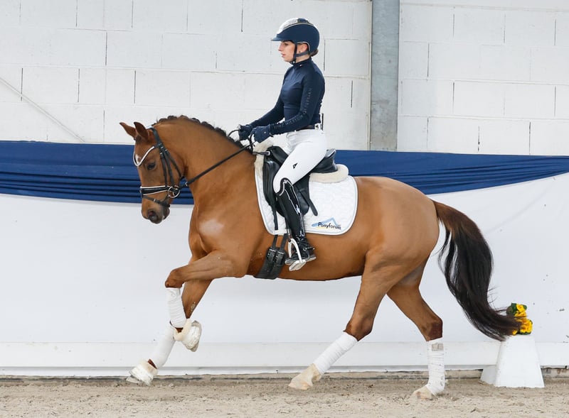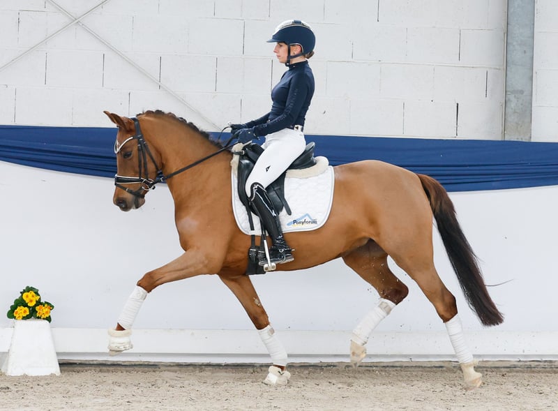 In unserer Kollektion stehen streng selektierte Reitponys f�r alle Anspr�che: Ausbildungs-, Zucht- und Kinderponys Hier gelangen Sie zur Gesamtkollektion: https://ponyforum.auction Erfolge: platziert in Reitpferdeprüfung, Stutenleistungsprüfung 8,13 in Münster-Handorf, Endringstute Elitestutenschau Münster-Handorf Mit der vierjährigen Dunkelfuchsstute Cover Girl steht ein beeindruckend ausdrucksstarkes Reitpony im Lot! Cover Girl ist ein Sportler durch und durch. Sie hat die benötigte Sporteinstellung und absolut positiven Go, den ein modernes Dressurpony einfach mitbringen muss. Sie liebt es, sich in Szene zu setzen und mit ihren dynamischen Bewegungsmöglichkeiten zu beeindrucken – ein echtes Cover Girl! Die Tochter des dreifachen Bundeschampions Cosmo Royale konnte im vergangenen Jahr dreijährig eine überragende Stutenleistungsprüfung mit einer Endnote von 8,13 absolvieren, zudem wurde sie auf der Elitestutenschau als Endringstute zur Staatsprämienstute gekürt. Ebenfalls konnte sie sich schon in einer Reitpferdeprüfung an 3. Stelle platzieren. Das perfekt im Maß stehende Nachwuchsdressurpony für ambitionierte Dressurreiter, die ein ausdrucksstarkes Pony suchen!