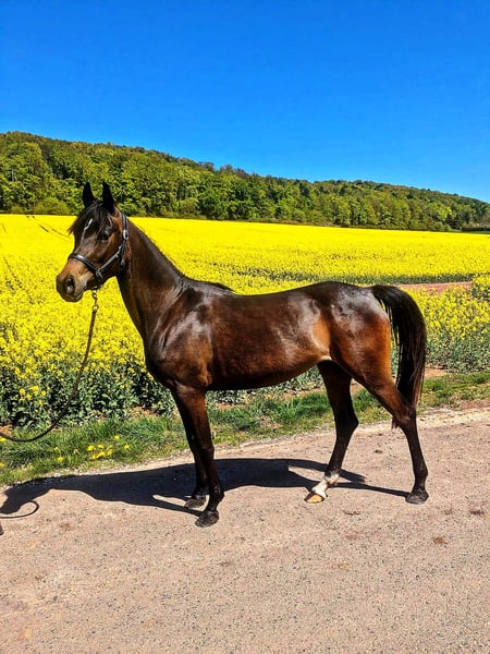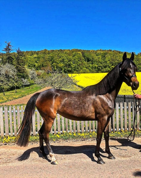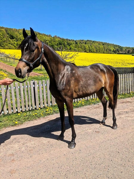 **For Sale: German Riding Pony Mare** For sale is a charming, dark brown mare of the German Riding Pony breed. Born in 2022, she has already developed into a promising young lady. With a height of 148 cm, she is ideally suited for riders looking for a talented partner for show jumping. This mare shows great potential in jumping and has already gained some experience under saddle. She is well-mannered, easy to handle, and always curious and eager to learn. She is suitable for both leisure and competition riding and is looking forward to experiencing much joy with her new rider. If you are interested or need further information, please feel free to contact me. Trial rides are possible by appointment. We look forward to your message!