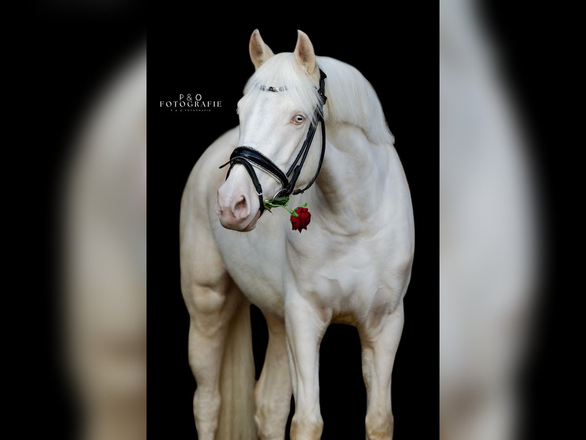 Zum verkauf steht eine bildhübsche 4 jährige deutsche Reitponystute in begehrter Perlino-Farbe. Abstammend von Champ de Luxe (FS Champion de Luxe einer der prägendsten Dressurponyhengste - Bundessiegerhengst, mehrfacher Championatsteilnehmer und ein top, top Vererber). Sie überzeugt mit drei qualitätsvollen Grundgangarten, sehr guter Mechanik und viel Elastizität. Besonders hervorzuheben sind ihr bergauf angelegter Galopp und ihr taktsicherer, schwungvoller Trab – beste Voraussetzungen für eine erfolgreiche sportliche Laufbahn. Super gut angelegtes Freispringen, auch kleine Sprünge unter dem Sattel sind ihr bekannt! Unter dem Sattel zeigt sie sich rittig, lernwillig und altersgemäß unkompliziert. Sie bringt ein angenehmes Go mit, bleibt dabei aber stets regulierbar und klar im Kopf. Auch auf dem Turnier wurde sie bereits von einem 12 jährigen Mädchen zwischen den Profis vorgestellt. Hier präsentiert sie sich souverän, entspannt und ohne zu gucken, auch bei den Richtern kommt sie stets gut an! Beste Perspektive für eine erfolgreiche Zukunft im Sport! Eine hochinteressante Nachwuchsstute für ambitionierte Reiter:innen, die Qualität, Größe und besondere Farbe vereinen möchten. Verladefromm, super verträglich mit anderen Pferden und Ponys. Kennt Trecker, Hunde, Katzen, Kinder.