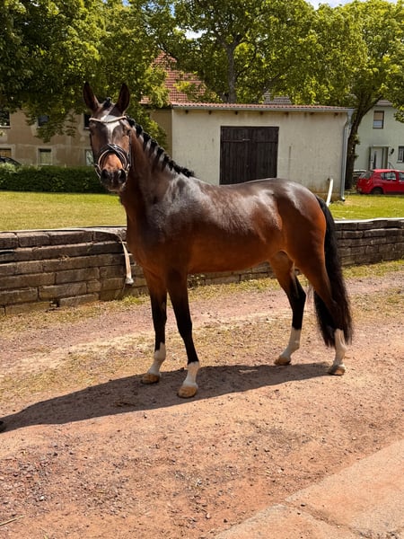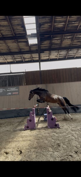 **Sales Advertisement: Charming German Riding Pony Mare** For sale is a beautiful German Riding Pony mare, born in 2022. With her elegant brown coat and a height of 150 cm, she is truly an eye-catcher both in appearance and character. This talented mare shows great potential in dressage and is well-suited for ambitious riders who enjoy training a young horse. She is well-mannered, well-educated, and already shows initial progress in her work under saddle. Our mare is healthy, regularly vaccinated, and dewormed. She is familiar with handling other horses and is manageable both in a herd and alone. If you are looking for a loving and talented partner for the future, we look forward to your message. Video available. State premium candidate!!! Current vet check available!!! Trial riding possible by appointment. Trial riding costs €30 and will be deducted from the purchase price.