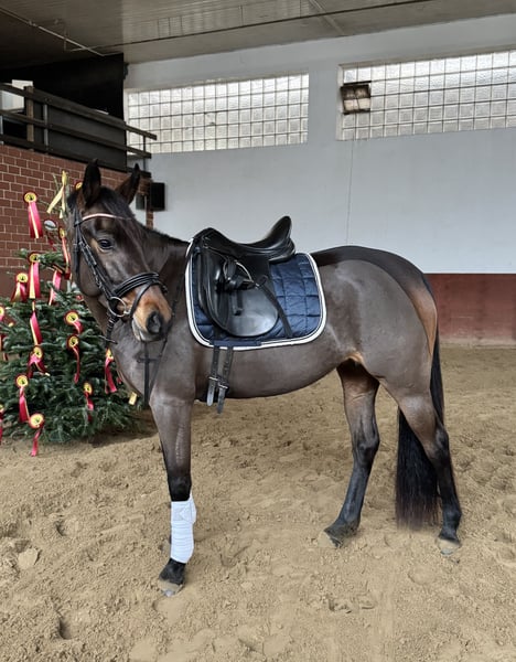 Brillant is a solidly trained, sensitive mare with great potential for both sport and leisure riding. She is confident off-road, eager to work, and enjoys dressage and jumping. She also demonstrates a clear head and a calm demeanor during fox hunting, combined with the necessary drive. Thanks to her movement and her calm, balanced temperament, she would also be very well suited as a hunter pony. She responds sensitively to aids and therefore requires a calm, balanced rider who can provide her with confidence. In daily handling, she is very well-behaved, straightforward, and affectionate. A versatile, easy-to-ride pony with a pleasant character – ideal for ambitious riders seeking a young horse with a solid foundation and development potential. Please feel free to contact us with any questions or if you are interested!