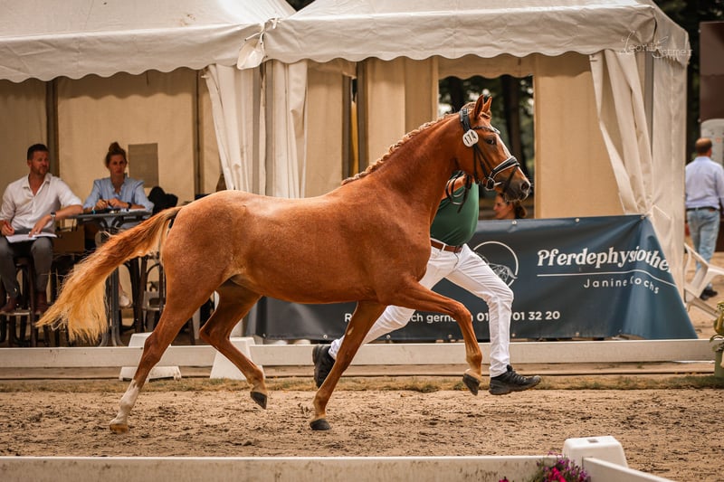 Sprzedajemy naszą bardzo interesującą, egocentryczną klacz StPrSt Assenmachers Deep Love. Klacz z ringu finałowego. Źrebna w 2025 roku po Assenmachers New Jersey, źrebię na razie nie będzie sprzedawane. Ojcem tej klaczy jest ultranowoczesny ogier jeździecki Damenheld po Donatelli (Dornik B). Matką jest ELSt i StPrSt. Golden Marry po FS Golden Moonlight. Babką jest nasz St.Pr.St. Cinderella, który również był ojcem naszego ogiera, wiceczempiona Bundeschampionatu i M-placed Glück Auf A NRW oraz jego pełnej siostry St.Pr.St. Golden Sugar A (po Hesselteichs Golden Dream). Golden Sugar A był 2. rezerwowym zwycięzcą Nadreńskiego Pokazu Elitarnego w 2018 roku. Jego rodowód obejmuje FS Champion de Luxe, Golden Dancer i Conquistador. Trzecią matką jest czempionka St.Pr.St. Ginette, sama siedmiokrotna matka ogierów (Sieshof's Maverick (po FS Maracaibo), FS Dandini, Dirty Dancer (oba po. FS Don't Worry), ujeżdżenie na poziomie L, Classic Dancer I (ogier premium i czempion Bundeschampion), Classic Dancer II, Classic Dancer III i Champagner de Luxe (wszystkie po FS Champion de Luxe), 20-krotna babka ogierów i 9-krotna babka ogierów. W tym liczne ogiery czempiony i ogiery premium. Ponadto czempionki Bundeschampionatu, czempionki klaczy, czempionki Niemiec, a także czempionki Europy: wnuczka St.Pr.St. Desert Rose (po FS Don't Worry) zdobyła złoto drużynowego czempionatu Europy w 2014 roku i złoto na DJM po tym, jak w 2009 roku została czempionką Bundeschampionatu, a prawnuk Der kleine König (po Dorniks Donovan) był drużynowym czempionem Europy w 2017 i 2018 roku.