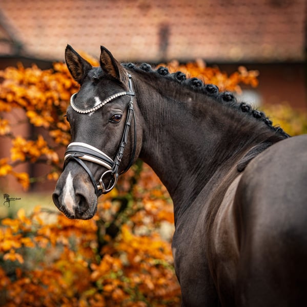 PK im unteren Bereich. Typvolle Nachwuchsstute mit hervorragender Rittigkeit, ausdrucksstarker Bewegung und züchterisch interessanter Abstammung Zum Verkauf steht eine äußerst typvolle, nahezu 5 jährige Stute von Cosmo Callidus, mit einem Stockmaß von 147 cm. Diese elegante, schwarzbraune Nachwuchsstute überzeugt durch ihr harmonisches Exterieur, ihren einwandfreien Charakter und eine überdurchschnittliche Bewegungsqualität – ein Nachwuchspony mit Perspektive sowohl für den Dressursport als auch für die Zucht oder im Parcours. Sie befindet sich in altersgemäßer Ausbildung und zeigt sich aktuell auf solidem A-Niveau, bietet allerdings schon eine hohe Versammlungsbereitschaft. Unter dem Sattel präsentiert sie sich taktsicher und durchlässig, mit konstanter Anlehnung und einer natürlichen Balance in der Bewegung. Ihre Rittigkeit, ihre feine Reaktion auf die Hilfen sowie ihr angenehm zu sitzender Bewegungsablauf machen sie zu einem echten Reiterpony mit großer sportlicher Zukunft bei ensprechender Förderung. In den Grundgangarten überzeugt sie mit hoher Bewegungsqualität. Den Trab zeigt sie mit ausgeprägter Mechanik, hervorragender Schulterfreiheit und aktiv arbeitender Hinterhand. Der Galopp ist bergauf angelegt, gut durch den Körper springend und stets im Gleichgewicht. Der Schritt ist taktsicher, raumgreifend und mit klarer Anlehnung. Am Sprung zeigt sie natürliches Vermögen und Übersicht, wurde jedoch nicht weiter gefördert, da mein Ausbildungsschwerpunkt im Dressurbereich liegt. Im täglichen Umgang ist sie ausgesprochen umgänglich, sehr menschenbezogen, liebesbedürftig aber auch leistungsbereit. Sie punktet mit feinem Interieur, Zuverlässigkeit und einem kontrollierten, intelligenten Temperament, wodurch sie auch für ambitionierte Kids oder Jugendliche interessant ist. Bei ihre Teilnahme an der Elitestutenschau in Wüsting konnte sie durch Typ, Fundament und Bewegungsstärke überzeugen. Auch züchterisch ist diese Stute von großem Interesse, da sie väterlicherseits über Cosmo Callidus wertvolles Leistungsblut führt und aus einer mütterlichen Linie stammt, in der sowohl No Limit (†) als auch Halifax (nicht mehr im Deckeinsatz) vertreten sind – eine selten gewordene und genetisch hochwertige Blutkombination, die sie zu einer interessanten Option für die Zucht macht. Eine ausgesprochen rittige, typvolle & einfache Nachwuchsstute mit emensem Bewegungspotenzial und wertvoller Abstammung – ideal für den Dressurnachwuchs, FEI oder die anspruchsvolle Zucht.