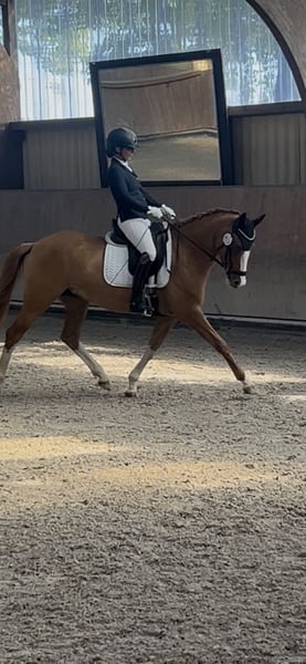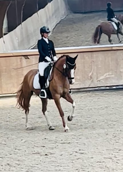 For sale is a very stylish, colorful 5-year-old mare (German Riding Pony). Donna has been with us since she was a foal and has been raised as a proper riding pony. At three years old, she was gently backed by us. This July, she was measured at 14.8 hands. She has an honest and reliable character and is equipped with a pleasant go. Her three basic gaits are very good, with the walk standing out in particular. She won the 4-year-old Pony Riding Horse Test and placed 2nd against larger horses. She has also been placed 2nd and 3rd in Dressage Horse A and L Dressage, competing against full-sized horses. We have already started working on extended trot, lateral movements, and L-level lessons, and she is quite stable in these. Our 13-year-old daughter has been riding her from the beginning. She is an absolute reliable pony, no matter the situation—whether in the field, indoor arena, or on the riding yard. She is always alert and focused. She masters her first jumps under saddle with ease and confidence. Due to lack of time, we have decided to sell her. If you are interested or would like more information, please feel free to call me at 015209130259.