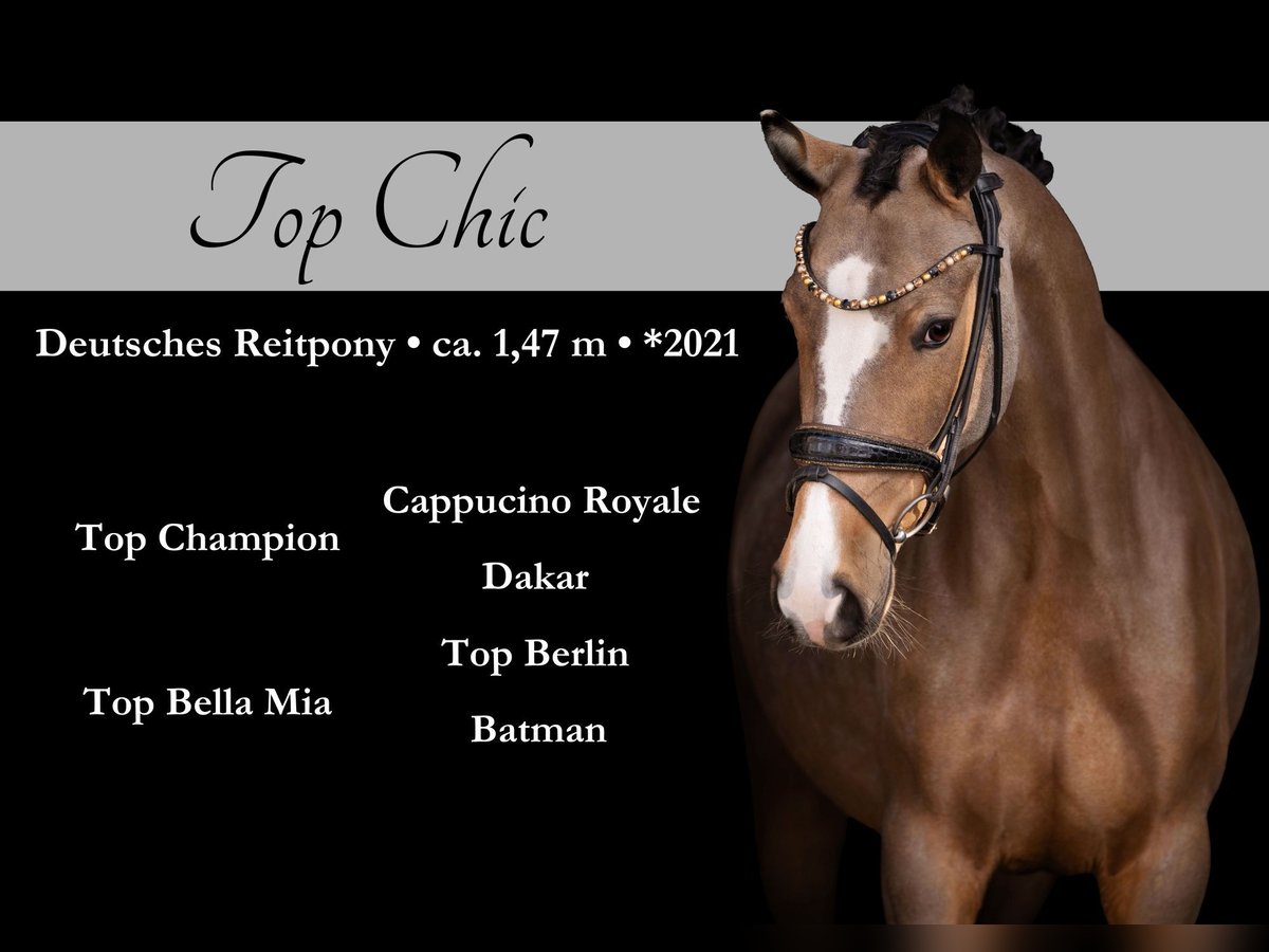 Dear Interested Parties, For appointment bookings and trial rides, please send me a WhatsApp message. During the day, I am reachable via WhatsApp for any questions, and you can contact me best between 4 p.m. and 7 p.m. by phone. I look forward to hearing from you. www.angelina-devittorio.de ⭐️Top Chic⭐️ Age: 5 years (2021) Height: measured at 1.48 m Bloodlines: Top Champion x Top Berlin Training level: Reitpferde level (basic riding horse) Health: Good X-rays available For sale is the five-year-old riding pony mare Top Chic, an exceptionally beautiful young prospect with excellent bloodlines from Top Champion and a Top Berlin mare. With a measured height of 1.48 m, she has the ideal size and offers a promising future for FEI classes. Her elegant brown coat with a hint of Isabella and her harmonious conformation make her a true eye-catcher. Top Chic is highly talented and impresses with three very good basic gaits, providing an excellent foundation for her further training. She is currently at a solid riding horse level. Due to time constraints, she has not yet been publicly shown, which is why she is offered below value. This presents a rare opportunity for ambitious riders to develop a pony with great potential. In character, she is sweet, uncomplicated, and very attentive to humans. She is currently also ridden by a well-versed child rider but, due to her young training level, is not suitable as a beginner pony. A rider with solid A-level riding skills and experience with young horses is desirable to further develop and nurture her talent. Thanks to her outstanding pedigree, Top Chic is also of great interest for breeding. She combines quality, presence, and potential – a pony with a future in sport and breeding. She is registered in the Studbook 1. ⚜️ Phone: 0171-3438949 ⚜️ Email: a.devittorio@web.de ⚜️ https://www.ehorses.de/angelinadevittorio ⚜️ Facebook and Instagram: Angelina De Vittorio