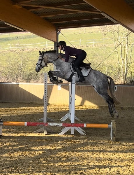 Bärbel is a 5-year-old pony mare born and raised on our farm. Her mother, a performance mare standing 1.60 m, was successful up to S* level and placed at S** during her active career. Bärbel’s sire, a licensed stallion standing 1.45 m, finished 4th in the final of the Bundeschampionat at age five, has won M-level show jumping competitions, and has competed in the German Championships and the "Preis der Besten." Bärbel is easy to ride and eager in her daily work. She has excellent reflexes over jumps and a superb technique. Her positive attitude towards jumping, combined with her remarkable talent, provides a great foundation for a future show jumping pony. She is not suitable for beginners or novice jumpers.