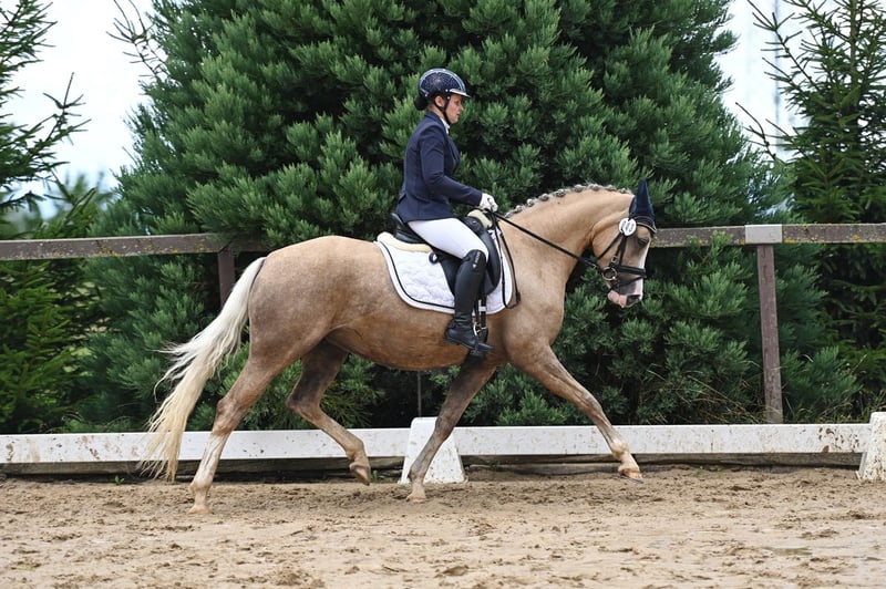 Un véritable attrape-regard : voici notre magnifique jument d’État primée « Dorie ». Elle allie un type de poney de dressage élégant à des allures de base harmonieuses, tout en étant agréable à manipuler. Dorie s’est déjà fait remarquer dès son poulain en remportant le titre de meilleure pouliche lors du Championnat des poulains de poneys de Thuringe. Jeune jument bien dressée, elle montre beaucoup de fougue sous la selle. Dorie est enregistrée dans le stud-book, performante en test de performance, et a reçu la prime d’État en 2024. Elle a été réserviste comme meilleure jument lors du Championnat des juments de poneys de dressage en Allemagne en 2024 en Thuringe. En 2025, Dorie a réussi à se placer avec succès dans des épreuves de dressage pour chevaux (contre des grands chevaux !). Son père, Genesis BL, a débuté sa carrière en 2018 lors de la sélection de poneys à Verden, où il a été vice-champion réserve. À 3 ans, il a été vainqueur au championnat hannovrien, et de 3 à 6 ans, il a brillé au Bundeschampionat à Warendorf. Il est aujourd’hui un gagnant régulier dans des épreuves de classe L. La mère de Dorie est la jument d’État primée Dahlia. Avant de commencer sa carrière en reproduction, Dahlia a été victorieuse en compétition jusqu’à la classe L. Elle compte à son actif trois fils agréés et deux juments primées d’État. Ses descendants sont actuellement performants en compétition jusqu’à la classe L. La demi-sœur maternelle de Dorie est la jument championne fédérale des juments orientées saut d’obstacles lors du FN Bundesstutenschau Sportponys 2024 à Münster, où elle a été distinguée par la prime fédérale. D’autres poneys allemands de dressage de qualité sont disponibles sur demande.