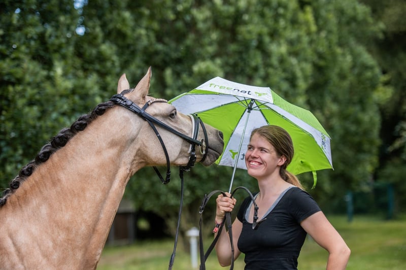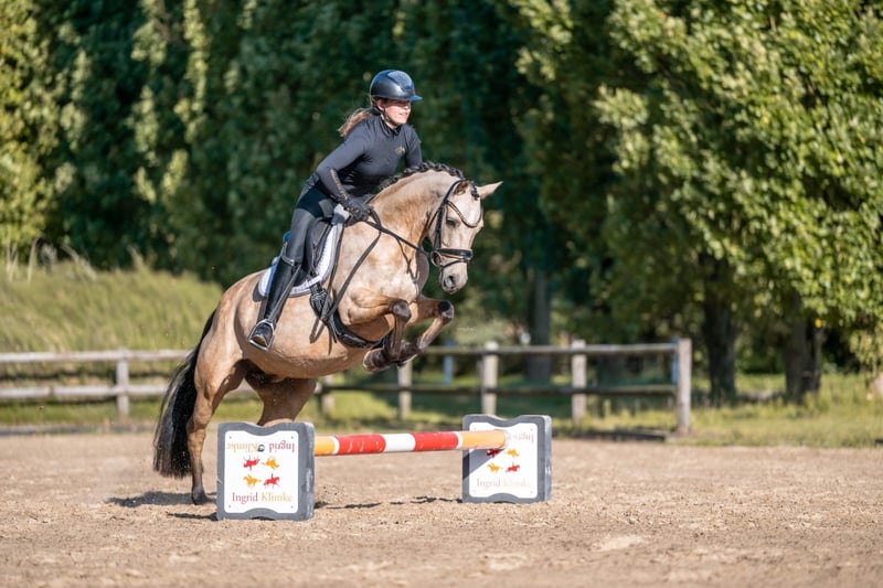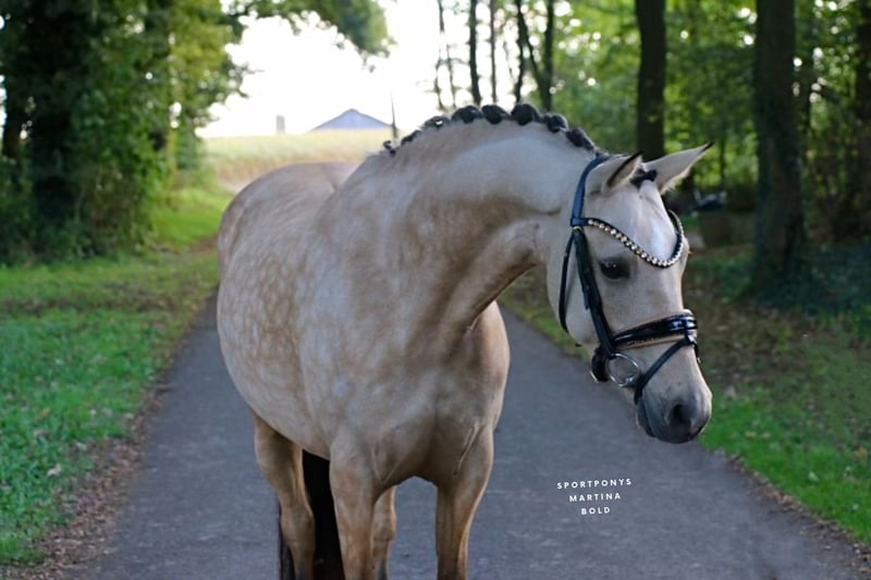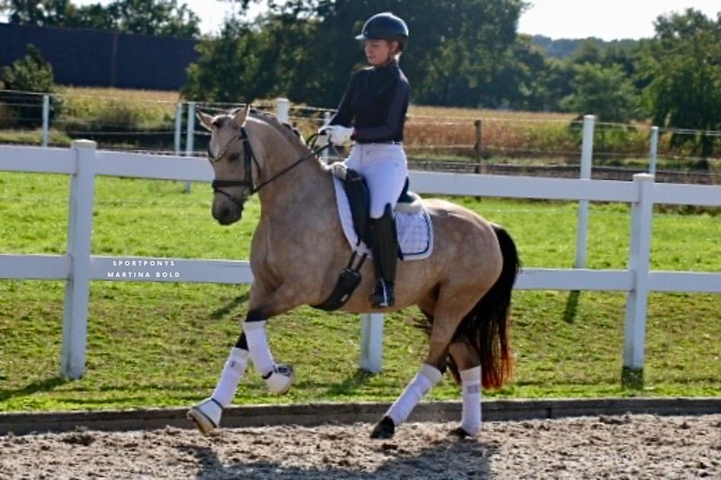 | DR | Stute | Buckskin | *2019| 145 cm | v. D-Power AT x Neverending Dream „Desert Cream“ ist eine bildschön aufgemachte Stute, die neben ihrer Optik auch mit drei sehr guten Grundgangarten überzeugen kann. Dies konnte „Creamy“ bereits 3-jährig bei ihrer Stutenprüfung, die sie mit einer Endnote von 8,45 absolvierte, eindrucksvoll unter Beweis stellen. Nach ihrer Prüfung bekam sie 4-jährig ein Fohlen und kam dann 5-jährig wieder unter den Sattel. „Creamy“ ist mit einer tollen Arbeitseinstellung und Rittigkeit ausgestattet. Egal ob Halle, Platz oder das fremde Turniergelände „Creamy“ zeigt sich stets souverän und lässt sich nicht aus der Ruhe bringen. Auch im Umgang ist die Stute absolut unkompliziert und brav. Bereits bei ihren wenigen Turniereinsätzen kann sie Siege und Platzierungen in A und L-Dressuren vorweisen. Im Training zeigt „Creamy“ zudem viel Geschick und Freude am Sprung, was aber bisher nicht weiter gefördert wurde. Mit dieser züchterisch, wie auch sportlich hoch interessanten Stute, stehen ihrem zukünftigen Besitzer bei weiterer Förderung alle Türen für den gehobenen Ponysport offen . Ein röntgonologischer Tüv incl. Rückenbildern von 2024 liegt vor. https://youtu.be/ZRkOqPOz8Ik?si=mUmQorHoQueMyTHv Bei ernsthaftem Interesse melden Sie sich gerne telefonisch unter der +491707941333.
