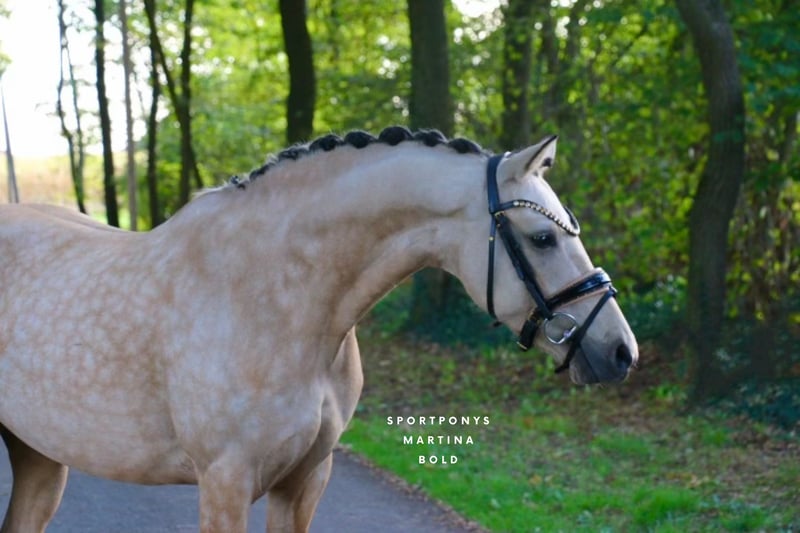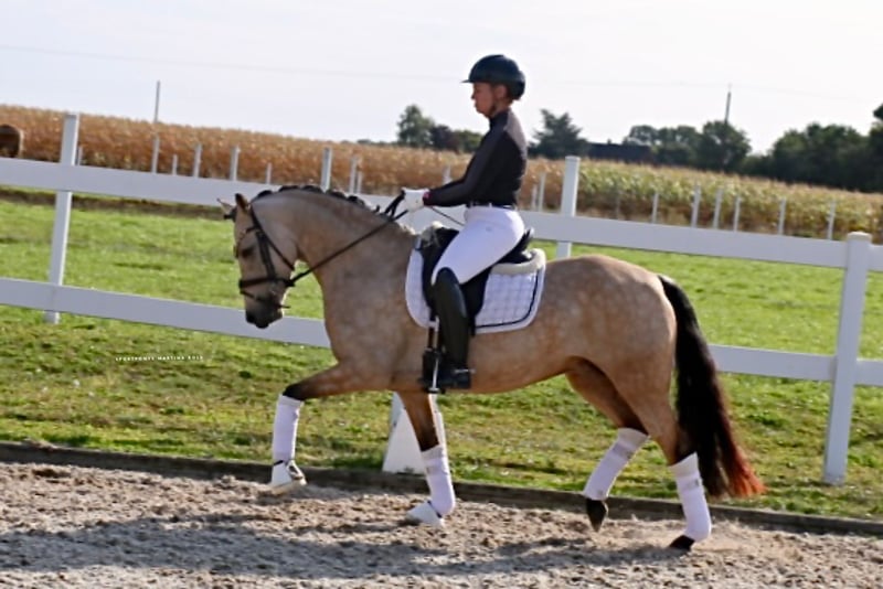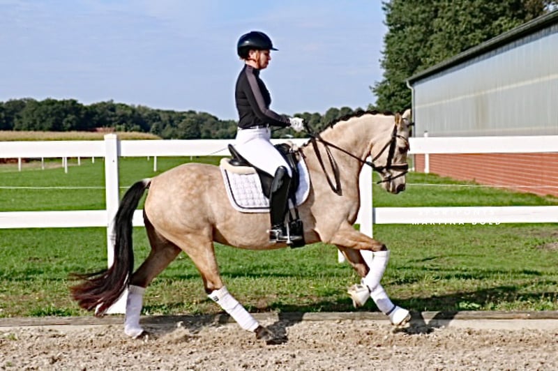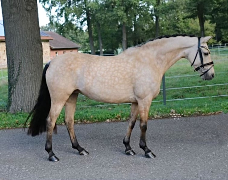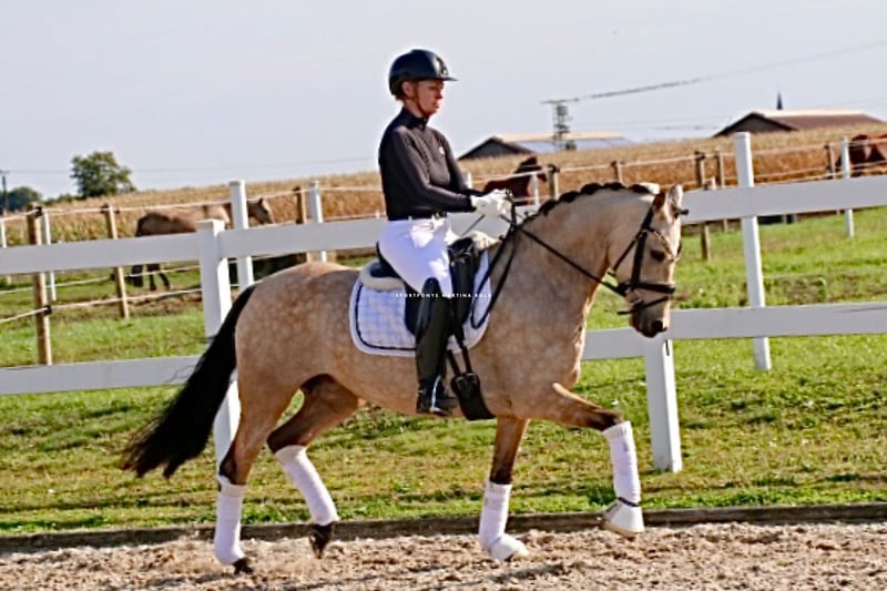 | DR | Mare | Buckskin | *2019 | 14.3 hh | s. D-Power AT x Neverending Dream “Desert Cream” is a beautifully presented mare who impresses not only with her looks but also with three very good basic gaits. “Creamy” showcased her abilities impressively at her mare inspection at the age of three, where she achieved an overall score of 8.45. After her inspection, she had a foal at the age of four and returned to work under saddle at five. “Creamy” is equipped with a great work ethic and rideability. Whether in the arena, on the flat, or at unfamiliar competition grounds, “Creamy” always presents herself confidently and remains unflustered. She is also very easy-going and well-mannered in handling. In her few competition appearances, she has already achieved wins and placements in A and L dressage tests. With this mare, who is highly interesting both in terms of breeding and sport, all doors to advanced pony sport are open for her future owner with further training. A radiological examination including back images from 2024 is available. https://youtu.be/ZRkOqPOz8Ik?si=mUmQorHoQueMyTHv For serious inquiries, please feel free to call +491707941333.