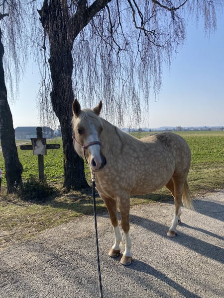 Verkaufe wegen Reitsportaufgabe meine 7 Jährige Deutsche Reitponystute Goldmarie. Sie ist eine sehr sensible und feinfühlige Stute die aber trotzdem Konsequenz und Struktur braucht. Ich habe sie seit Jährling, sie stand bei mir immer im Offenstall, ist sehr sozial und braucht den Auslauf. Boxenhaltung akzeptiert sie zwar, sie wird aber schnell ungeduldig und fängt an an der Türe zu klopfen usw. 24h Heu funktioniert leider auch nicht so gut, ich kann ihr aber leider nichts anderes bieten und daher war sie bei mir immer viel zu dick. Sie braucht ebenfalls begrenzten Weidegang, typisch Pony eben. Sie wurde schonend angeritten , ist sehr fein an den Hilfen wurde aber das letzte Jahr fast nur vom Boden aus gearbeitet bzw ausgeritten. Geht alleine und in der Gruppe ins Gelände, ist aber teilweise schreckhaft. Generell eher nichts für Anfänger oder Kinder, man sollte schon sattelfest sein und Erfahrung mit jungen Pferden haben. Sie hatte 2024 eine Plazentitis und dadurch leider eine Totgeburt. Sie wurde dannach gut behandelt und gespült, wir haben sie aber dann nicht mehr gedeckt. Ob man sie zur Zucht verwenden könnte, müsste man vorher ordentlich abklären. Sie ist vorne beschlagen weil unser Gelände sehr steinig und viel Straße ist, beim Hufschmied und Tierarzt verhält sie sich vorbildlich. Hängerfahren ist grundsätzlich kein Problem. Ich verkaufe Goldi nur weil Sie zu schade zum rumstehen ist und einfach immer dicker wird. Vielleicht bekommt sie die Chance bei jemanden der sie schätzt und ordentlich mit ihr arbeit. Bitte keine reinen Preisanfragen. Gerne per whatsapp anfragen, bin telefonisch immer erst ab 15 Uhr erreichbar.