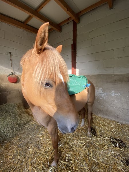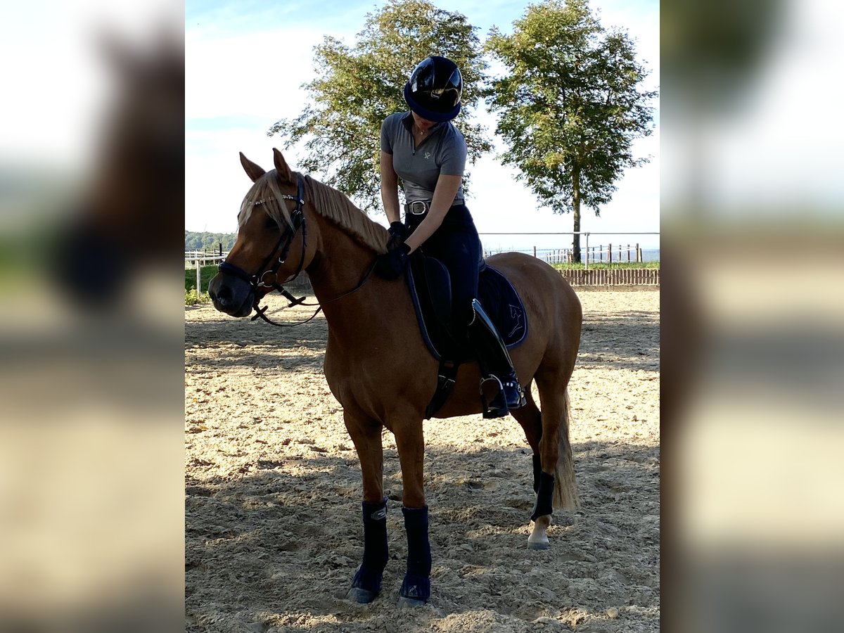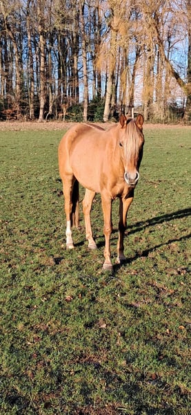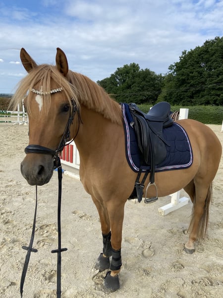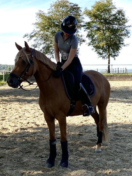 Zum Verkauf steht eine 7-jährige deutsche Reitponystute mit einem Stockmaß von 147 cm. Sie stammt ab von Dimension AT NRW x Dressman und bringt damit eine interessante sportliche Perspektive mit. Da sie auch Staatsprämienstute ist, wäre sie auch für die Zucht sehr interessant. Aufgrund eines längeren Auslandsaufenthaltes hat “Stuti“ im Juni 2025 ein gesundes Fohlen von „Der Goldjunge AT“ bekommen. Nach der Fohlenpause darf sie nun wieder antrainiert werden, was ich leider aufgrund von Studienbeginn und Umzug nicht selbst übernehmen kann. Ich habe sie 4-jährig selbst angeritten und verfügt daher über eine solide Grundausbildung auf sicherem A-Niveau. Natürlich muss dies nach der Pause wieder etwas aufgefrischt werden. Stuti ist sehr lernbereit und zeigt sich im Umgang sehr brav, neugierig und dem Menschen immer zugewandt. Ich hatte selten ein Pony welches so freundlich und aufgeschlossen ist. Unter dem Sattel ist sie ehrlich und angenehm zu reiten. Durch ihr ausgeglichenes Wesen kann ich mir sie auch sehr gut als Kinder- oder Jugendpony mit weiterer Förderung vorstellen. Das Pony ist natürlich Schmiede- und Verladefromm und zeigt keinerlei Unarten. Mit anderen Ponys und Pferden ist sie stets verträglich. Auch war ich mit ihr viel im Gelände unterwegs, wo sie immer brav und unerschrocken war. Auch wenn sie noch nicht auf Turnier vorgestellt wurde, hatten wir sie öfters mit zum Auswärtstraining, wo sie immer total unkompliziert war. Kein Geglotze oder Ähnliches. Ich wünsche mir definitiv einen Langzeitplatz für sie, wo sie nicht als Sportgerät gesehen wird, sondern als Familienmitglied zählt. Außerdem ist es mir wichtig, dass sie in ihrem neuen Zuhause täglichen Weidegang mit anderen Ponys/Pferden genießen darf. Ich könnte sie mir auch gut in einem Offenstall vorstellen, dies ist aber kein Muss. Mit ihrem guten Charakter, der sportlichen Abstammung und dem passenden Stockmaß ist sie ein interessantes Pony für ambitionierte Nachwuchsreiter. Das vorletzte Bild zeigt ihr Fohlen aus 2024 und letzte Bild zeigt sie aktuell. Sie steht momentan in der Nähe von Osnabrück.