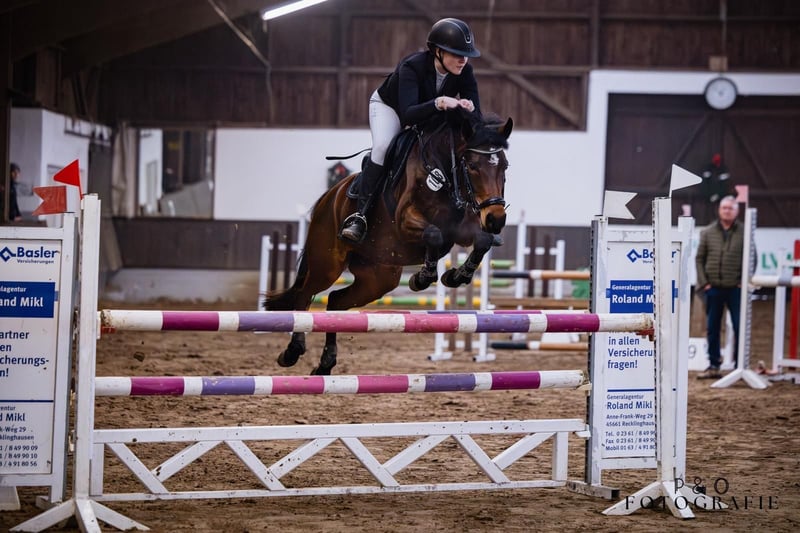 For sale is our 7-year-old German Riding Pony mare, Rina DH. The charming mare impresses both with her temperament and her previous sporting achievements. She has already won an 8.5 in the Class L show jumping pony test. In 2024, she was placed in the final of the five-year-old show jumping ponies at the German Federal Championships. Additionally, she has been placed multiple times in A** show jumping competitions. A special highlight of her career is her title as Westphalian Champion 2024 in the five-year-old show jumping ponies, as well as the Vice Westphalian Champion title 2025 in the six-year-old show jumping ponies. Rina is very light in the hand, always motivated during work, and shows great overview along with a strong scope for jumping. She is very cautious at the fences, yet well-equipped with enough talent. She always aims to please her rider and presents herself as honest and eager to perform. She has also been introduced in dressage and has achieved placings in WBO E- and A-level dressage tests. In daily handling, Rina is well-behaved and uncomplicated. She is shoe-friendly, loading-friendly, and easy to handle. She is an excellent pony for ambitious young riders seeking a successful and reliable sport pony.