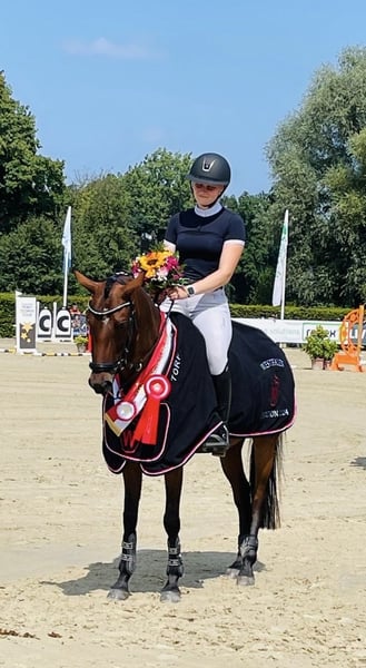 À vendre, notre ponette allemande de 7 ans, Rina DH. Cette ponette sympathique séduit tant par son tempérament que par ses performances sportives à ce jour. Elle a déjà remporté un examen de saut d'obstacles niveau L avec une note de 8,5. En 2024, elle s’est classée parmi les meilleures lors de la finale des poneys de saut de 5 ans au Championnat fédéral. Elle a également obtenu plusieurs places en épreuves de saut de classe A**. Un moment fort de sa carrière est le titre de Championne Westphalie 2024 chez les poneys de saut de 5 ans, ainsi que le titre de Vice-Championne Westphalie 2025 chez les poneys de saut de 6 ans. Rina est très légère à la main, toujours motivée au travail, et montre beaucoup d’aisance ainsi qu’un excellent coup de saut. Elle est très prudente à l’obstacle, tout en étant dotée d’un bon potentiel. Elle souhaite toujours faire plaisir à son cavalier, se montrant honnête et prête à performer. Elle a également été présentée en dressage, où elle a obtenu des places en épreuves WBO E et A. Dans son comportement quotidien, Rina est calme et facile à gérer. Elle est chaussée, déchargée et manipulée agréablement. C’est une ponette idéale pour un jeune cavalier ambitieux recherchant un sport de haut niveau, fiable et performant.
