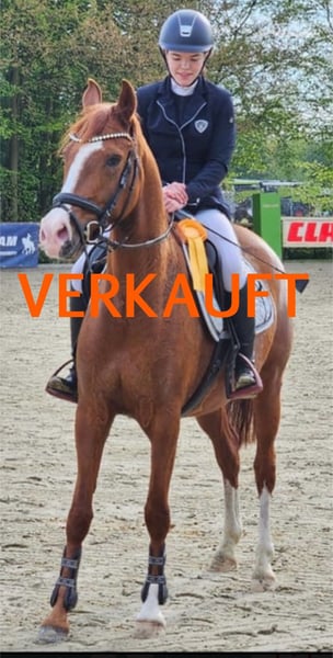 Deutsches Reitpony Tot schickes, bewegungsstarkes und sprungvermögenenes Pony! War Elitefohlen Mutter ( Staatsprämien -und Leistungsstute) wurde im Freispringen mit einer 9,0 belohnt und ist L-Dressur platziert. 5jährige Stute Erstes Turnier direkt gesiegt in Gewöhnungsspringpferdeprüfung. Super lieb, von Kindern zu reiten. Geht brav ins Gelände. Nie krank gewesen. Direkt 2jährig vom Züchter gekauft und selber ausgebildet. Zähne sind frisch gemacht Abstammung: Nancho‘s Golden Star x Couscous (Champion de Luxe) Bei Interesse gerne melden oder direkt unter der Telefonnummer 015117923855 (WhatsApp vorhanden)