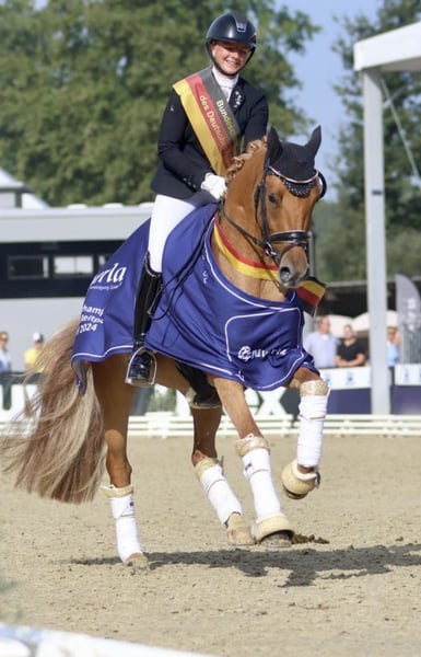 Vendo la mia cavalla pony da dressage come fattrice di altissimo livello, con una genealogia eccezionale! Glamour Girl, figlia di Golden Grey NRW e Dimension AT, in elegante colore castano scuro, è nata nel 2018 e ha un'altezza al garrese di 141 cm. È la sorellastra del campione nazionale 2024 e vicecampione nazionale 2025, "DSP Goldschatz". Anche sua madre, la cavalla premiata di Stato Diva Crema, è stata finalista al Bundeschampionat nel 2016. A causa della sua altezza, è stata solo messa al lavoro a terra e successivamente utilizzata esclusivamente come fattrice. In maneggio e dal ferratore si comporta molto bene e con dolcezza. Ha già avuto due puledri da FS Next Diamond, nel 2023 e nel 2024, entrambi caratterialmente impeccabili e di ottima taglia. Attualmente non è in gravidanza. Purtroppo, a causa di una riduzione del patrimonio, sono costretto a cederla! Viene affidata solo a persone serie e solo come fattrice!