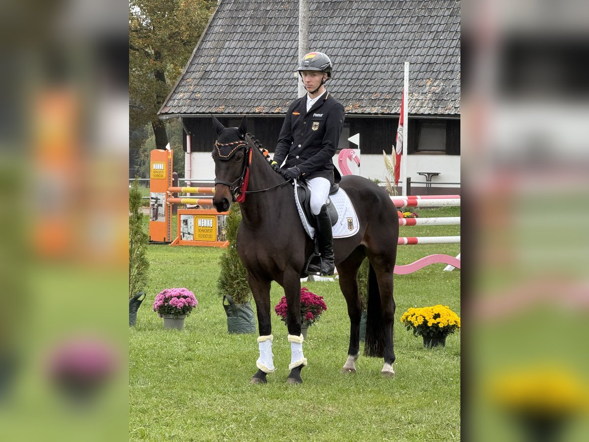 Due to the end of my son's "pony age," we are selling our 8-year-old full-sized mare Gwendolyn. The pony has achieved wins and placings in show jumping up to 1.15 m (has jumped up to 1.25 m) and in eventing up to CCIP**L level. Last year, Gwendolyn was part of the national eventing squad. She jumps very confidently and carefully, so we can also see her competing in show jumping. Stopping is not an option for Gwendolyn. Due to her temperament, her eagerness to move forward, and her always positive attitude towards jumping, she is not suitable for beginners or small children. Gwendolyn is straightforward and gentle in handling. She is healthy but occasionally nicks herself when she has opportunities to rest her hooves in the box, which is why we are offering her below market value. Her unconditional willingness to perform and her excellent attitude towards sport are remarkable. Thanks to her size, she also suits larger riders.